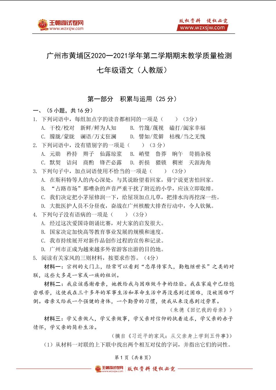 广州市黄埔区2020一2021学年第二学期期末教学质量检测七年级语文(人教版)