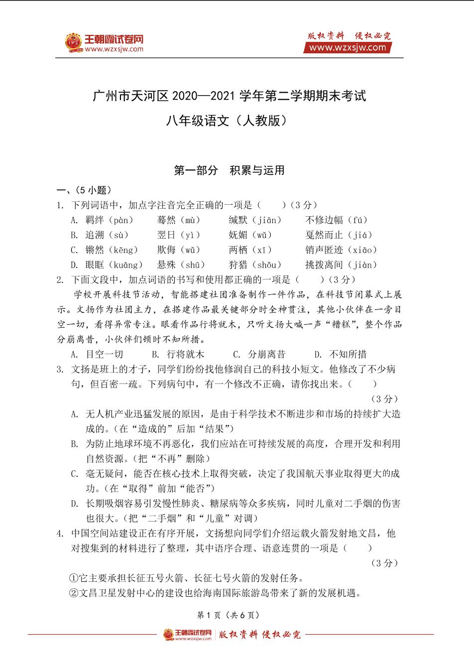 广州市天河区2020—2021学年第二学期期末考试八年级语文(人教版)