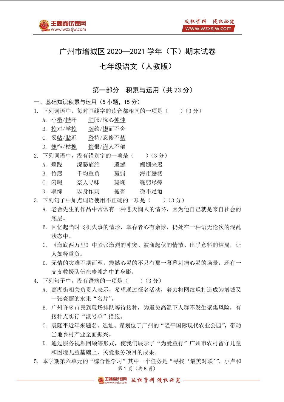 广州市增城区2020—2021学年(下)期末试卷七年级语文(人教版)