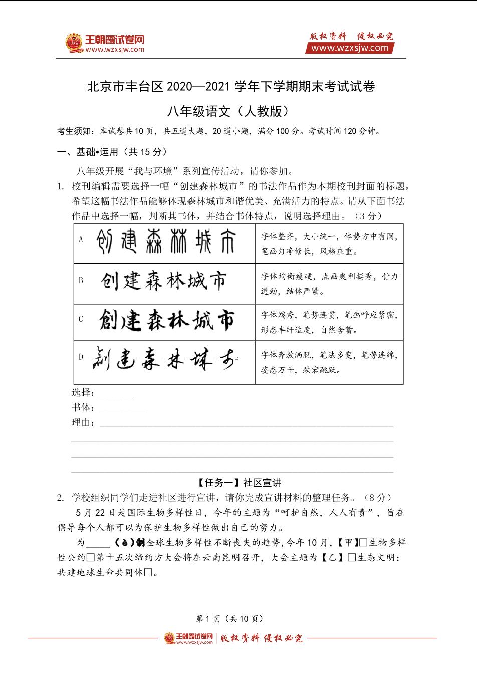 北京市丰台区2020—2021学年下学期期末考试试卷八年级语文(人教版)