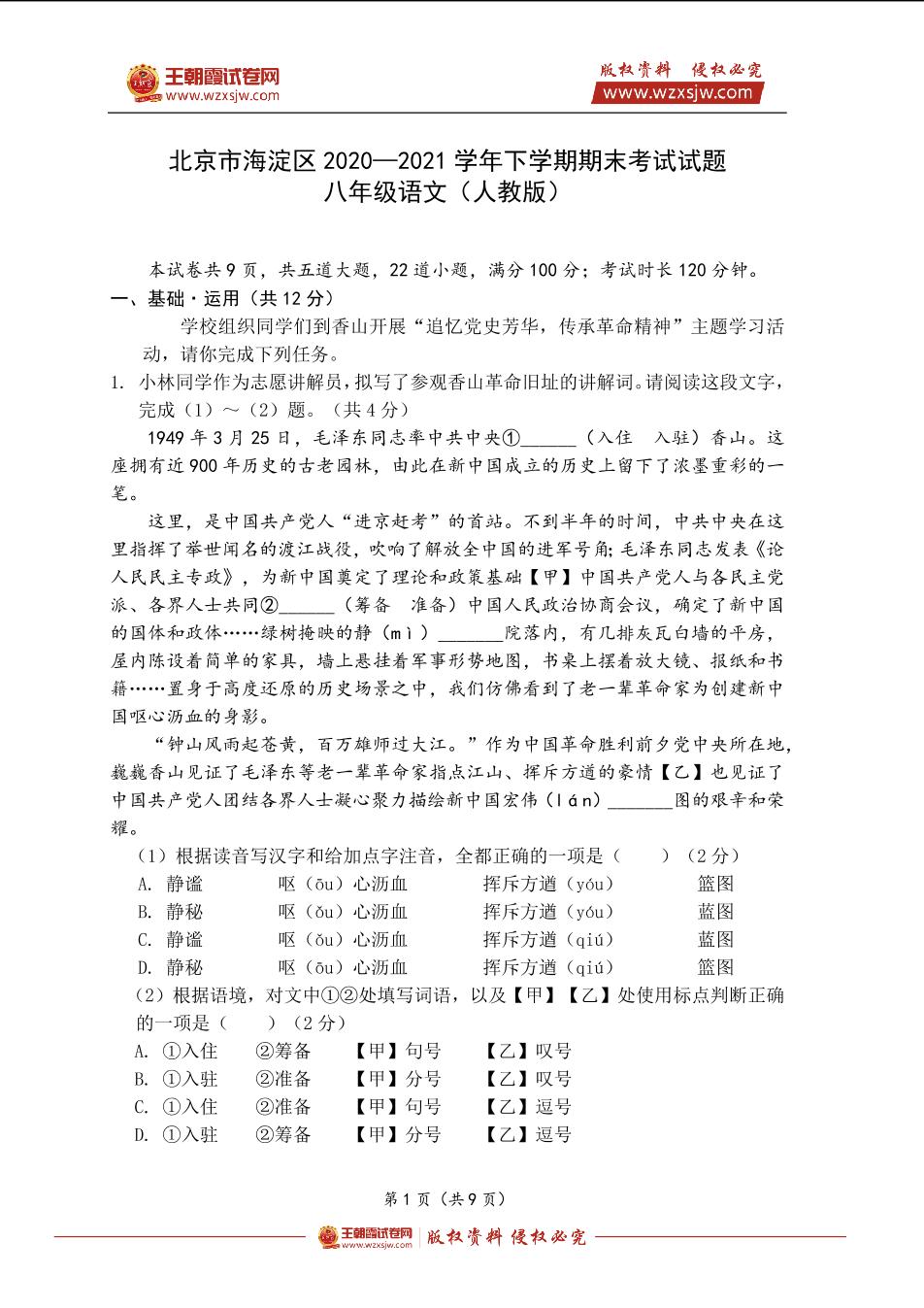 北京市海淀区2020—2021学年下学期期末考试试题八年级语文(人教版)