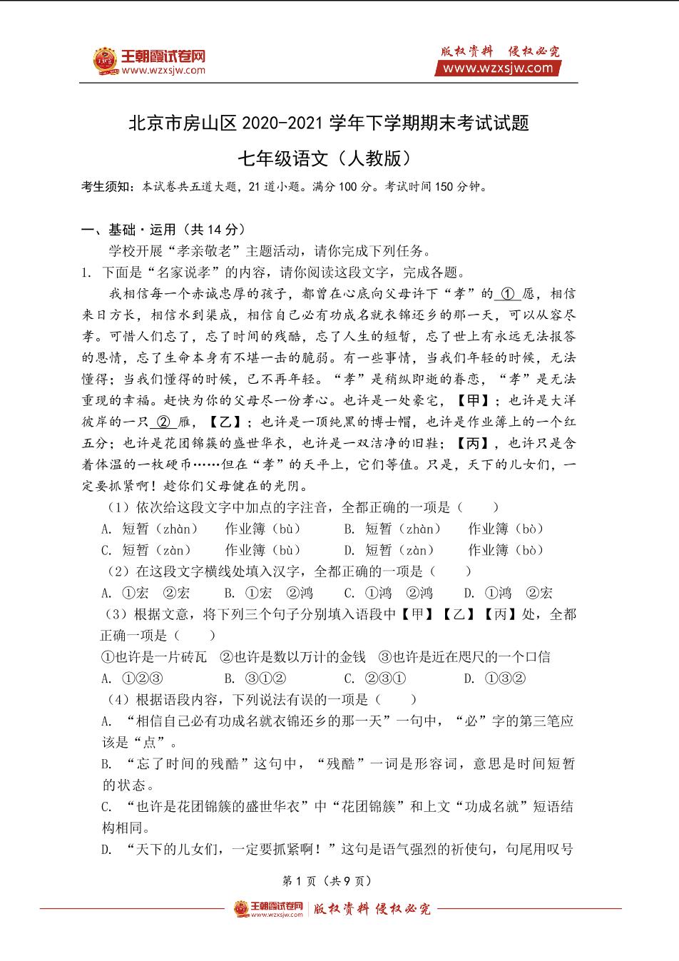 北京市房山区2020—2021学年下学期期末考试试题七年级语文(人教版)
