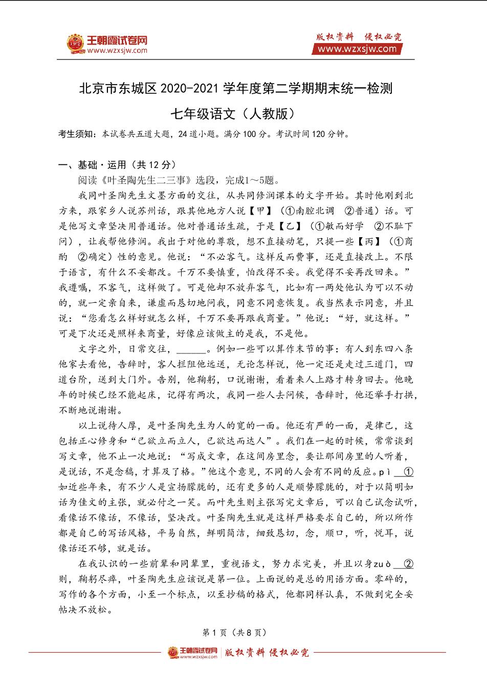北京市东城区2020—2021学年度第二学期期末统一检测七年级语文(人教版)