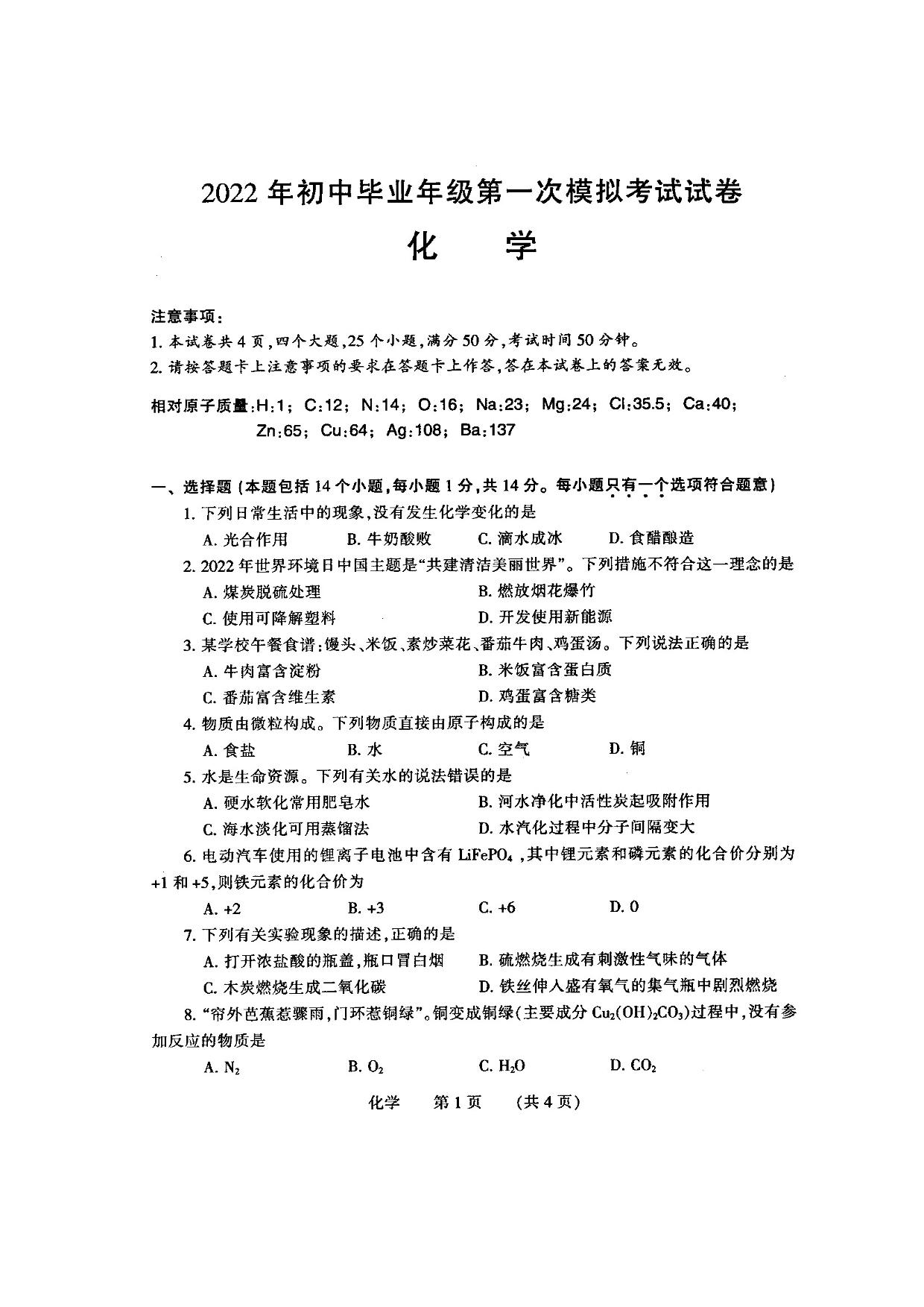 濮阳市2022年初中毕业年级第一次模拟考试化学试卷
