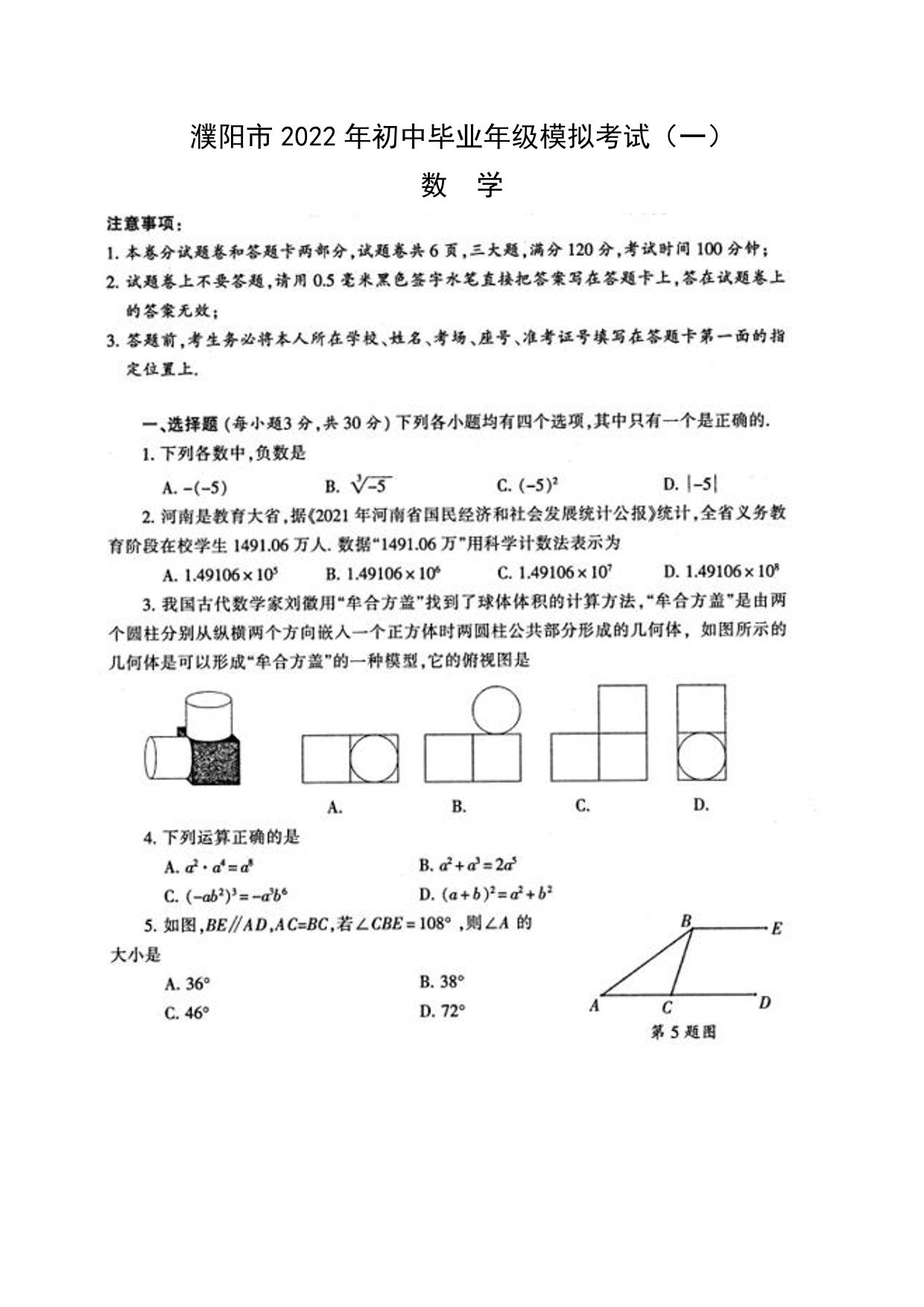 濮阳市2022年初中毕业年级模拟考试(一)数学试卷