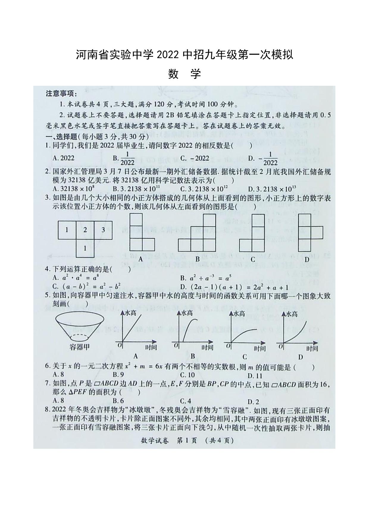 河南省实验中学2022中招九年级第一次模拟数学试卷