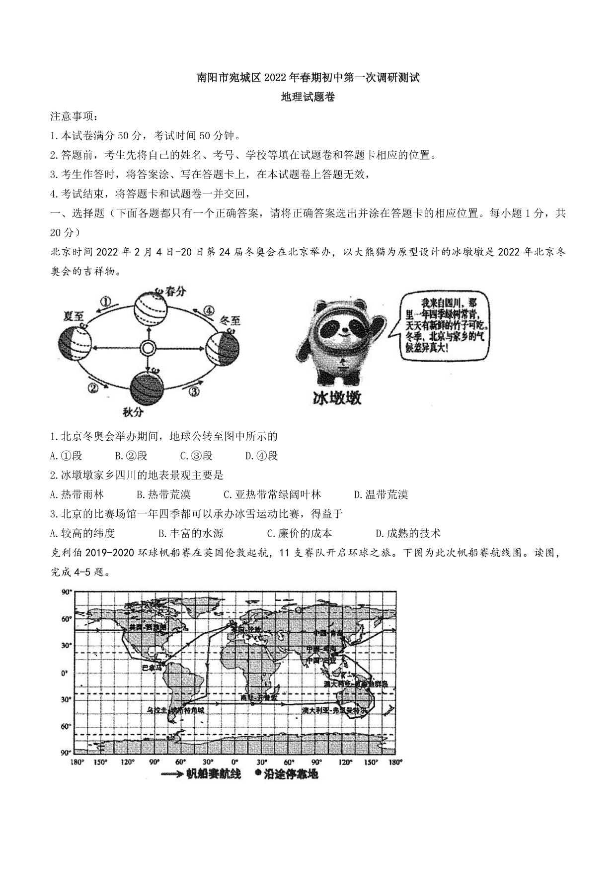 2022年南阳市宛城区春期初中第一次调研测试地理