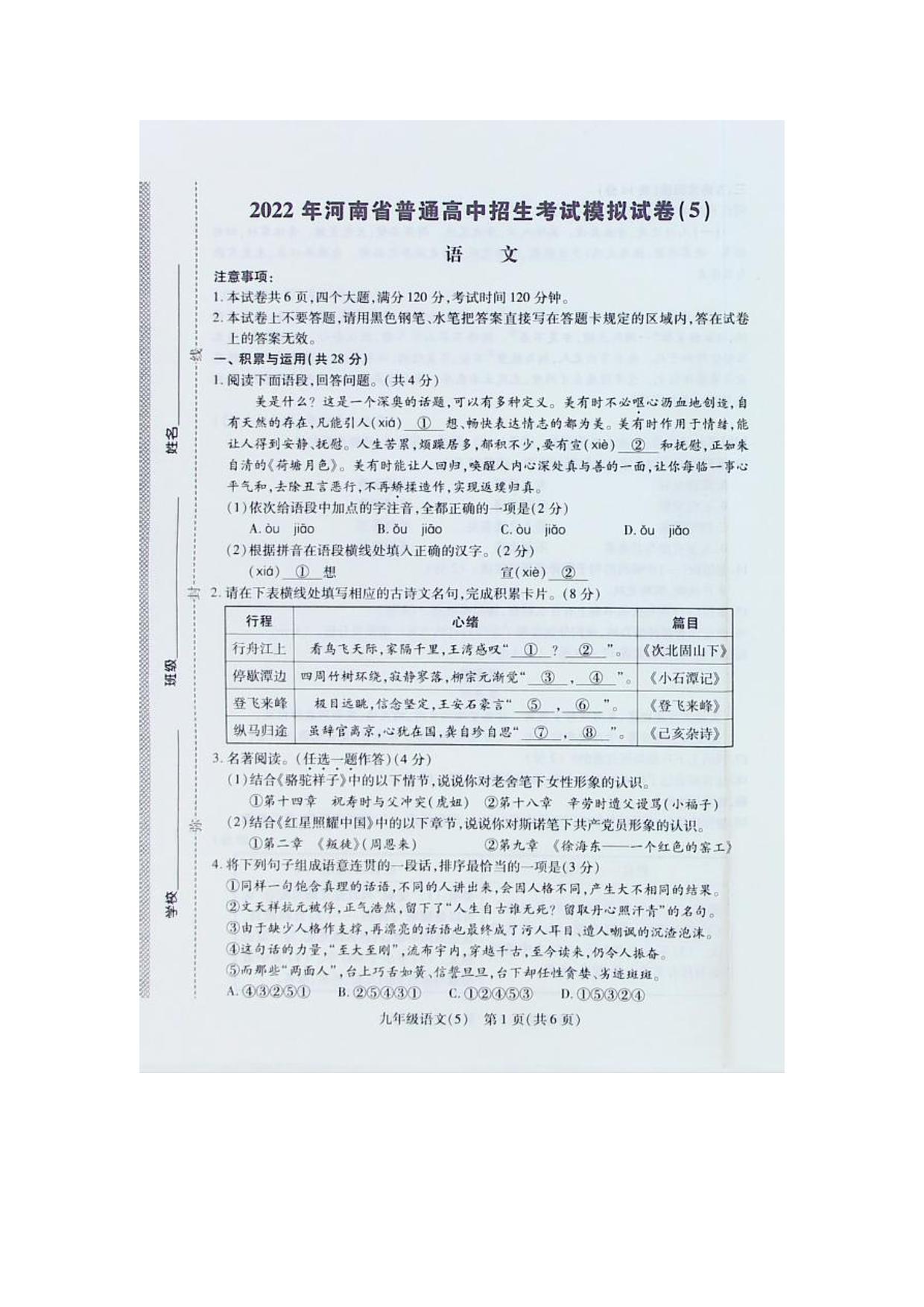 2022年河南省许昌市普通高中招生考试摸拟试卷语文(5)