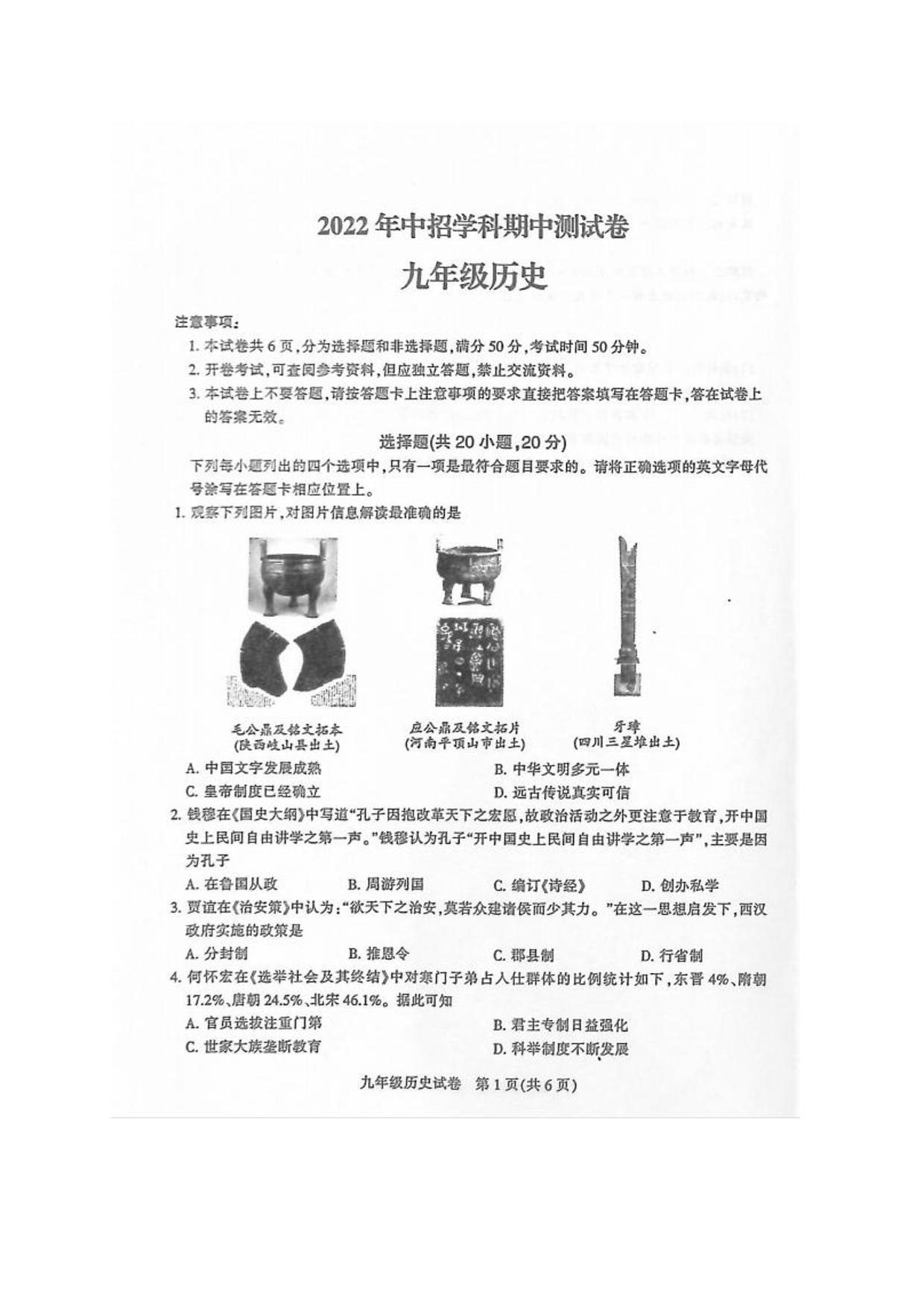 河南省平顶山市2021-2022学年九年级下学期中招学科测试(一调)历史试题