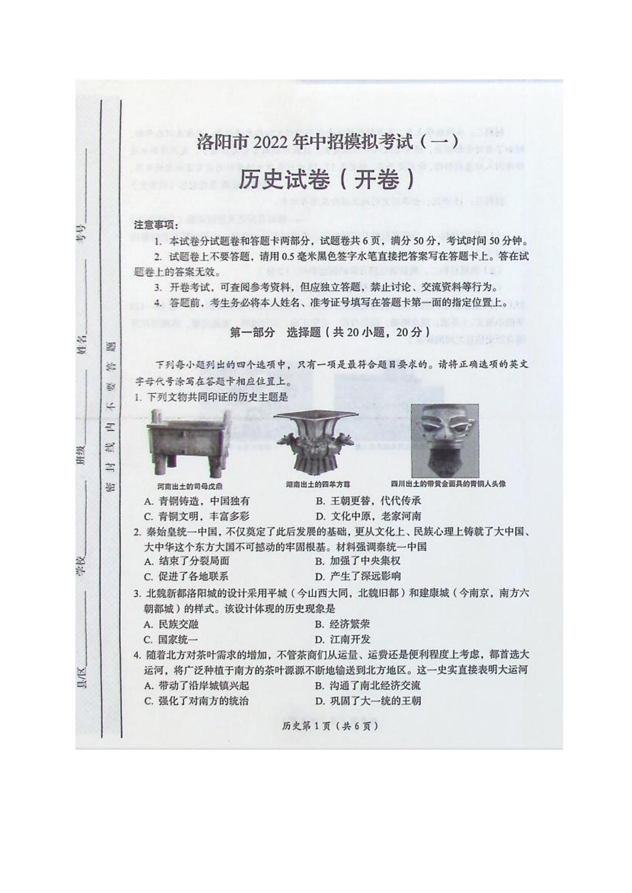 河南省洛阳市2022年中招模拟考试(一)历史试卷(开卷)