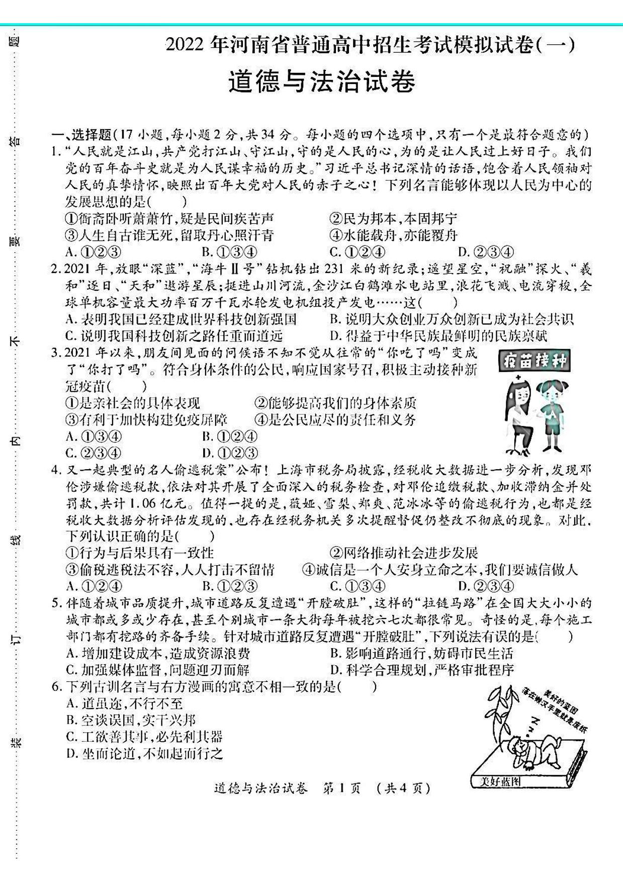2022年河南省普通高中招生考试模拟试卷(一)道德与法治试卷