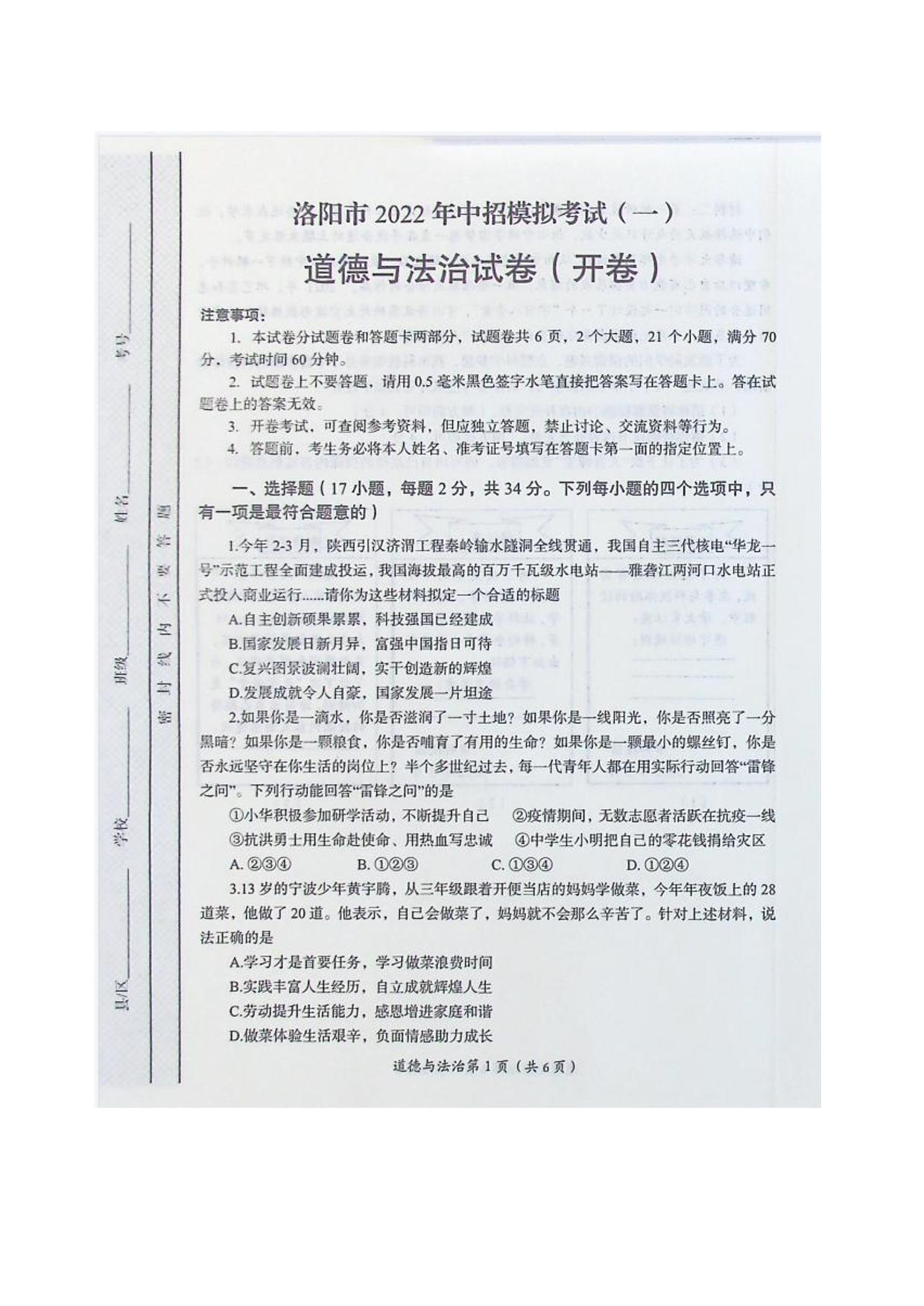 洛阳市2022年中招模拟考试(一)道德与法治试卷(开卷)