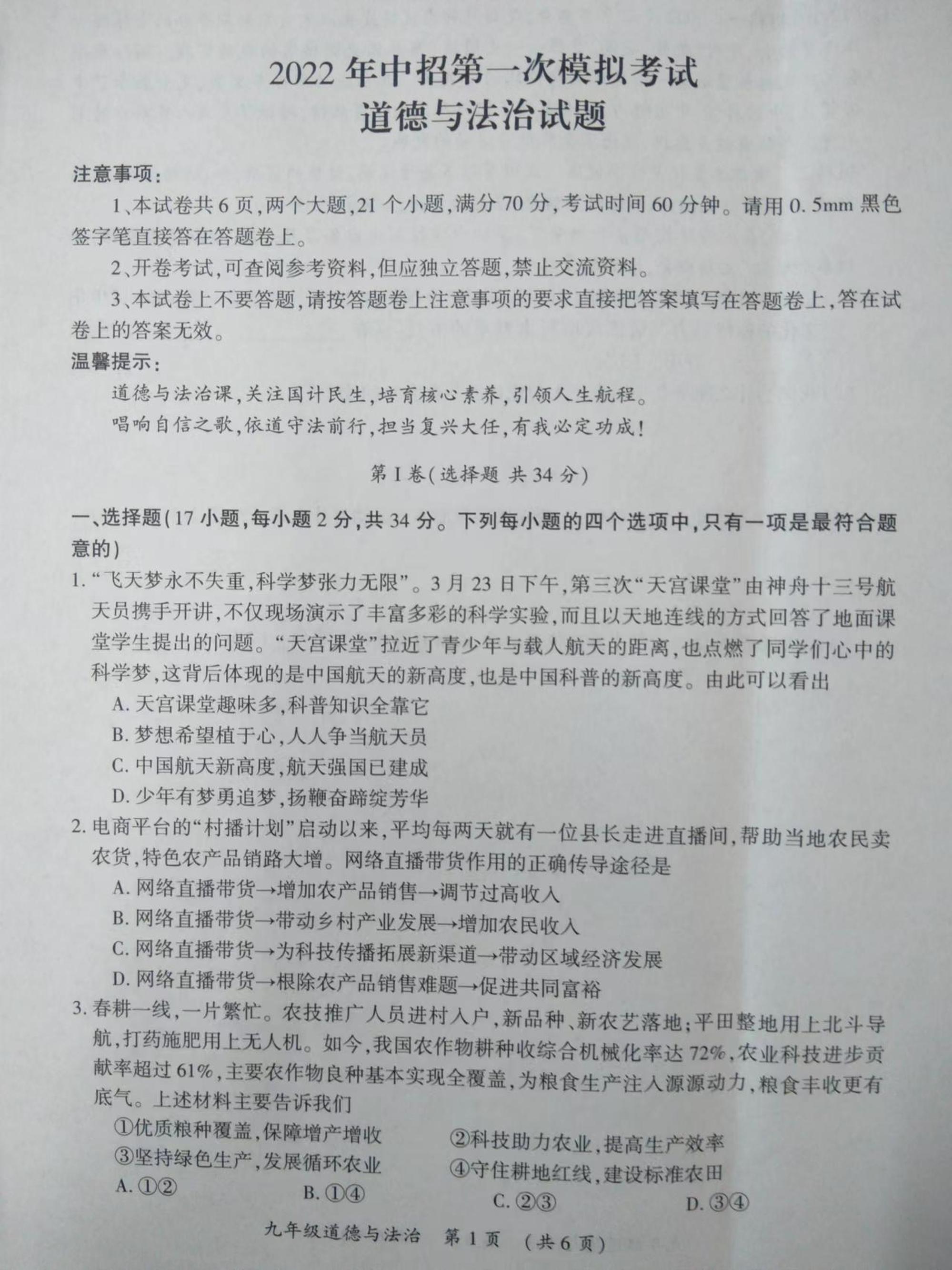 2022年河南省开封市九年级一模考试道德与法治试题