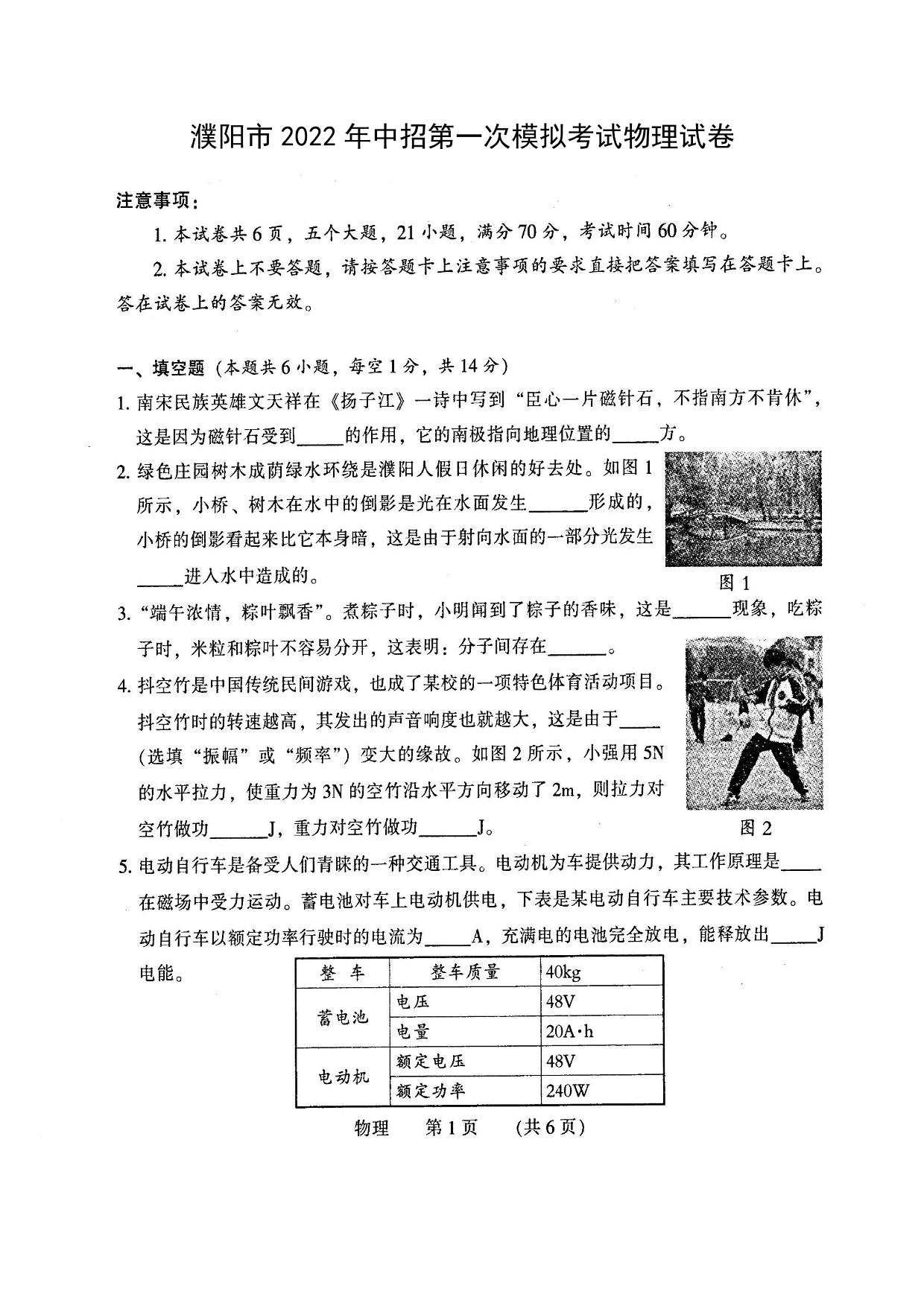 濮阳市2022年中招第一次模拟考试物理试卷