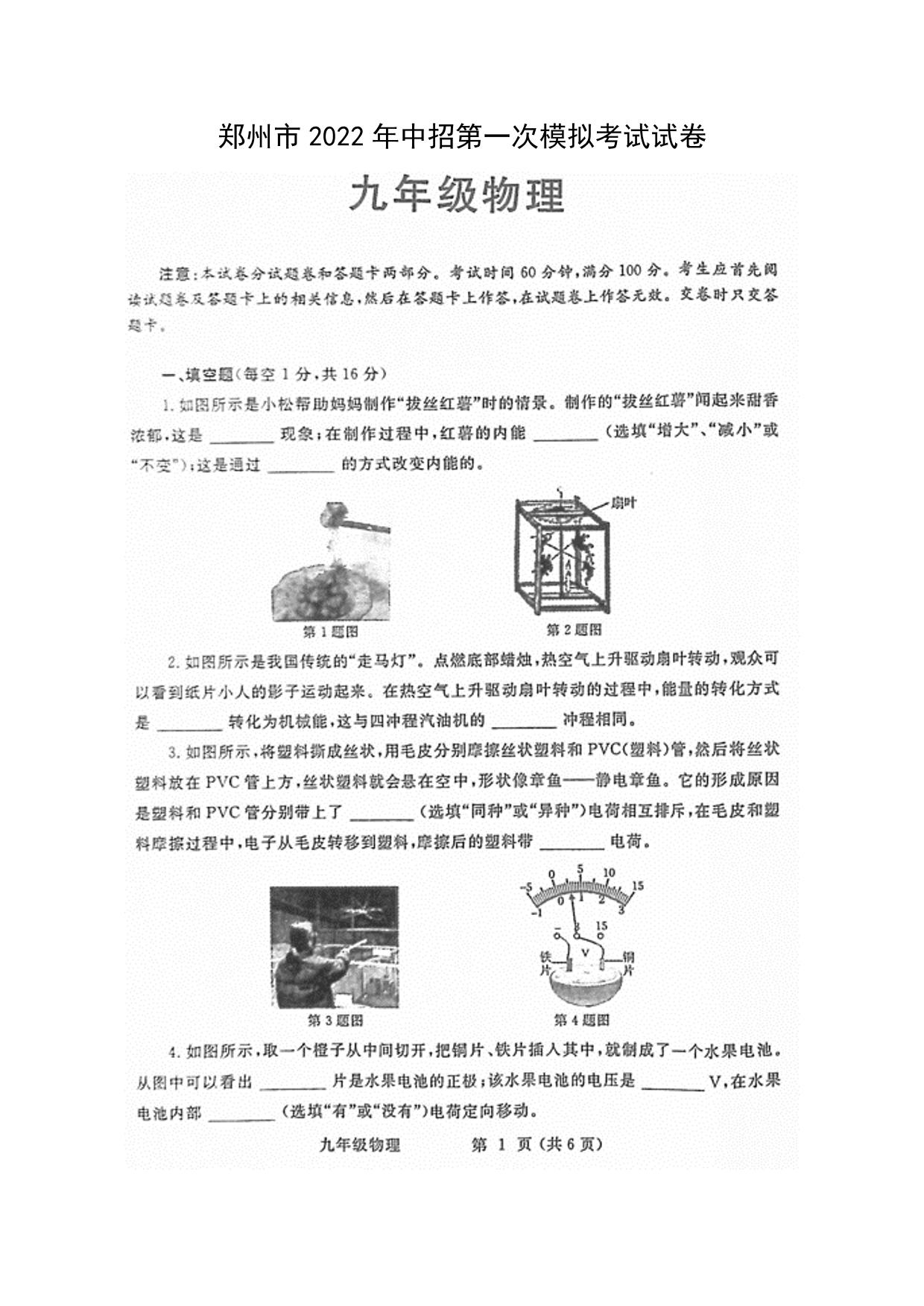 郑州市2022年中招第一次模拟考试物理试卷