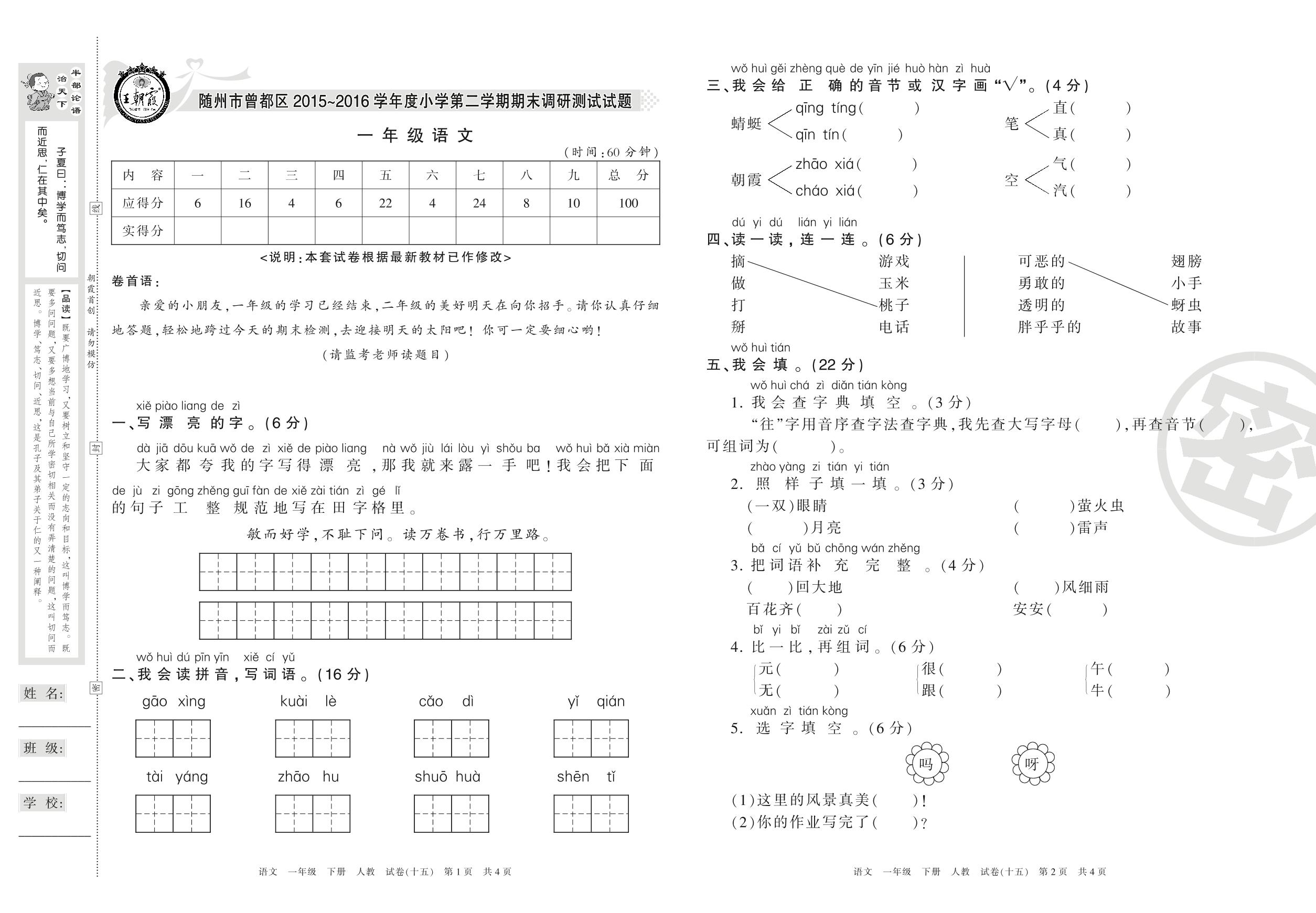 2015-2016学年第二学期随州市曾都区一年级语文试卷(人教版)【15】