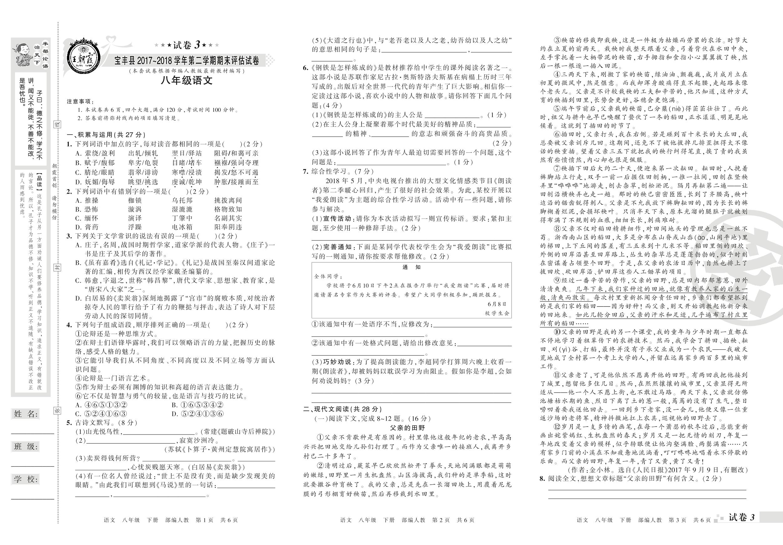 2017-2018学年第二学期平顶山市宝丰县八年级语文试卷(人教版)【3】