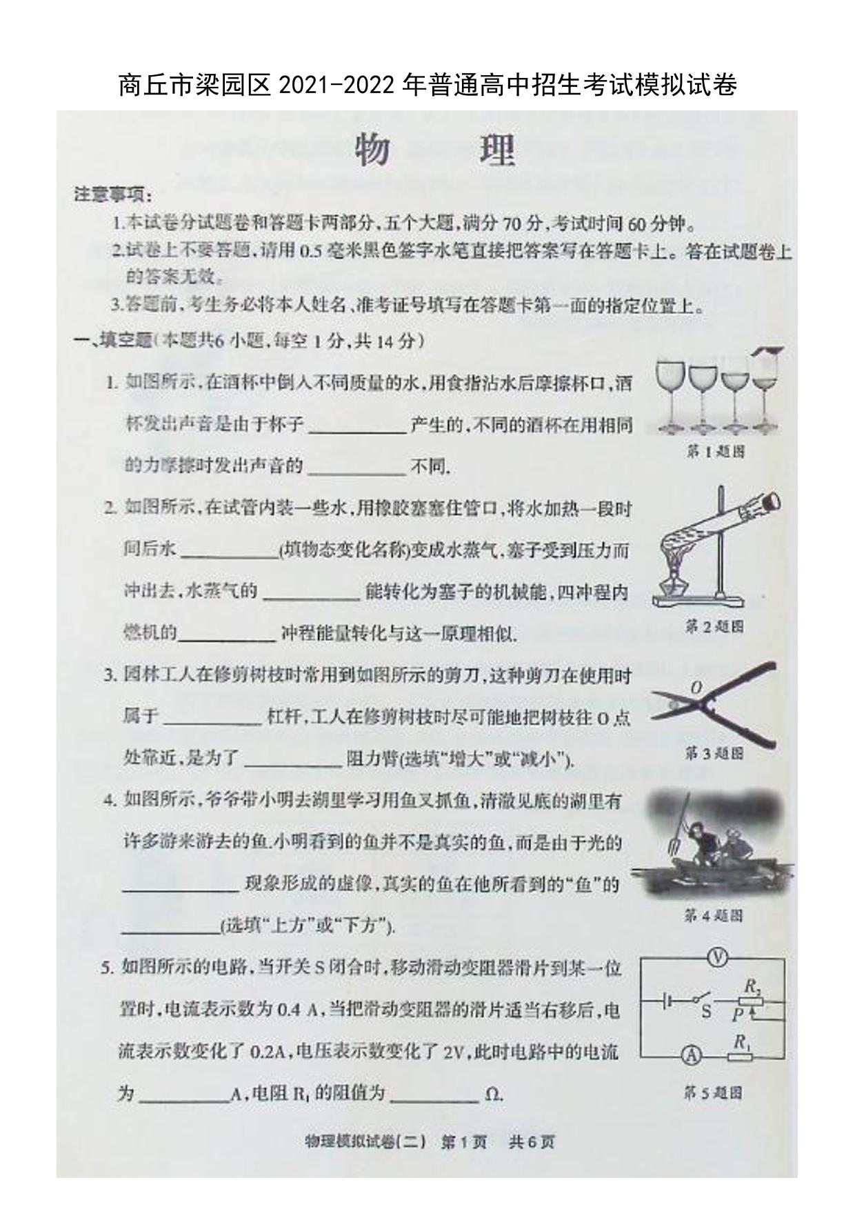 商丘市梁园区2021-2022年普通高中招生考试物理模拟试卷