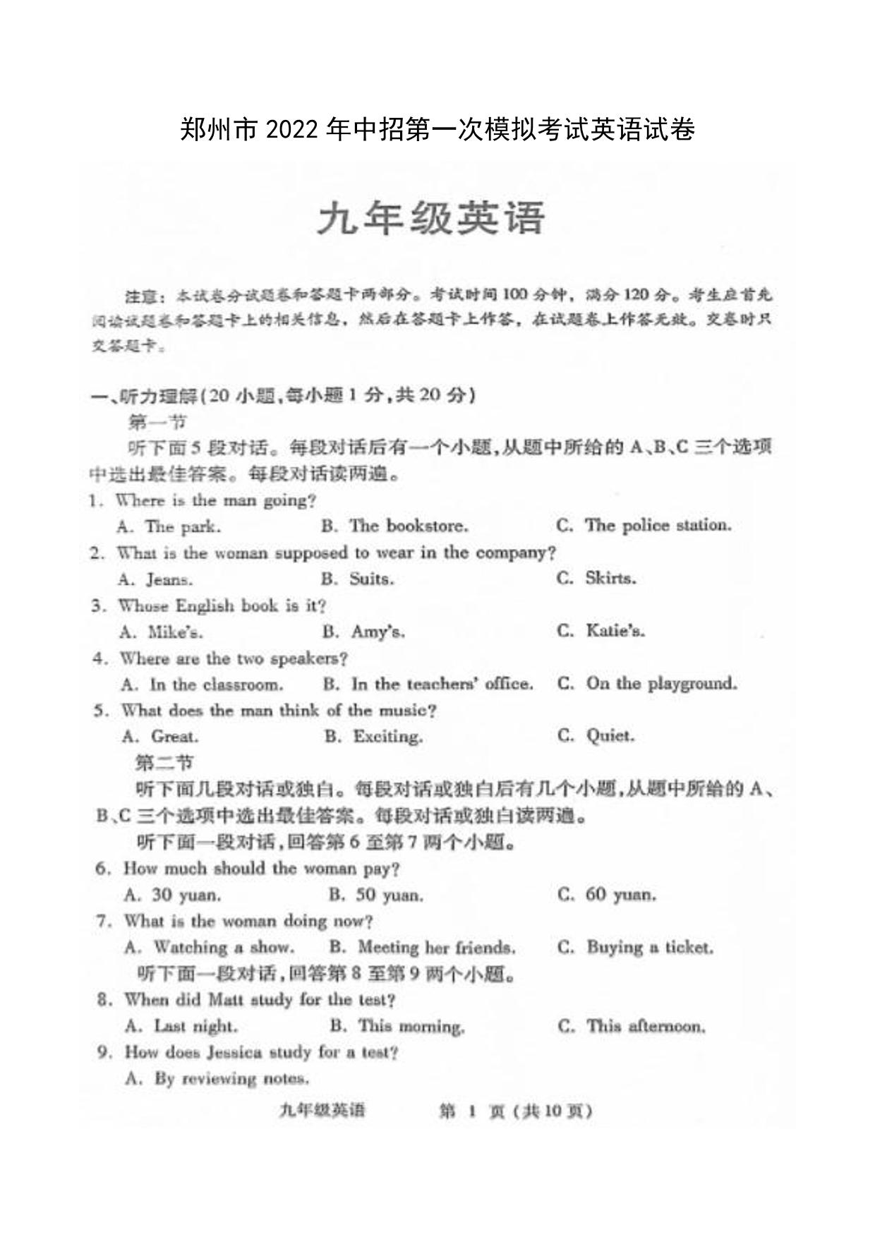 郑州市2022年中招第一次模拟考试英语试卷【无听力音频】