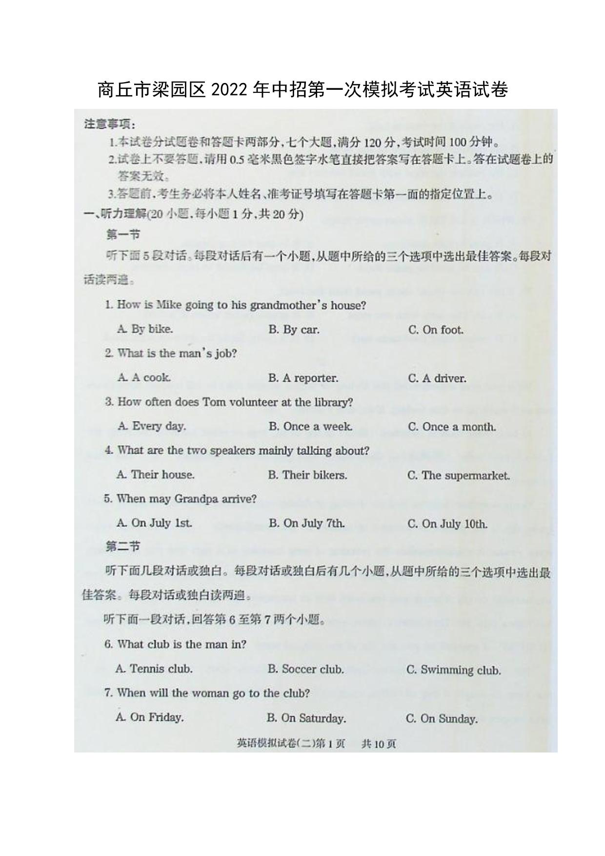 商丘市梁园区2022年中招第一次模拟考试英语试卷【无听力音频】