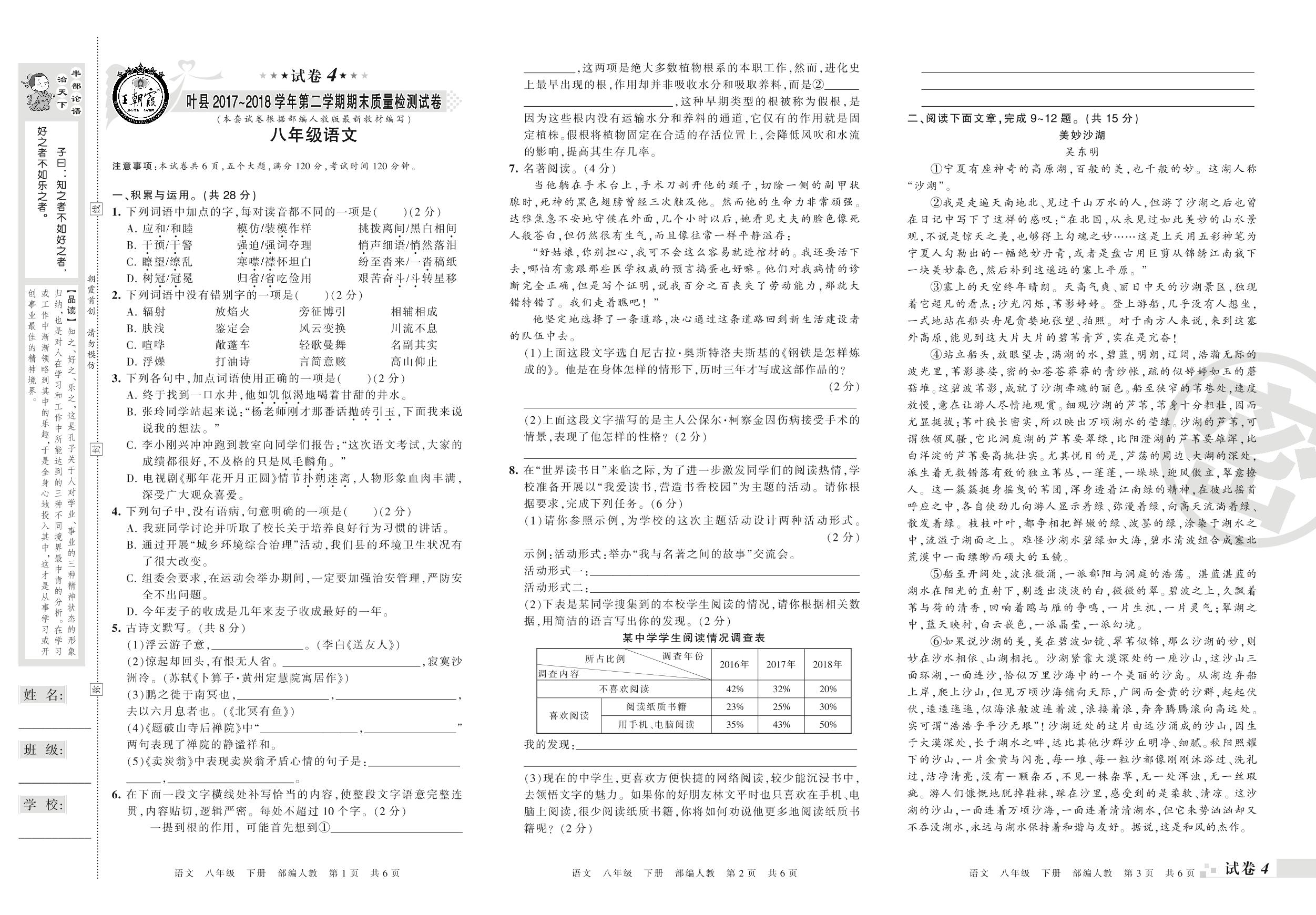 2017-2018学年第二学期平顶山市叶县八年级语文试卷(人教版)【4】