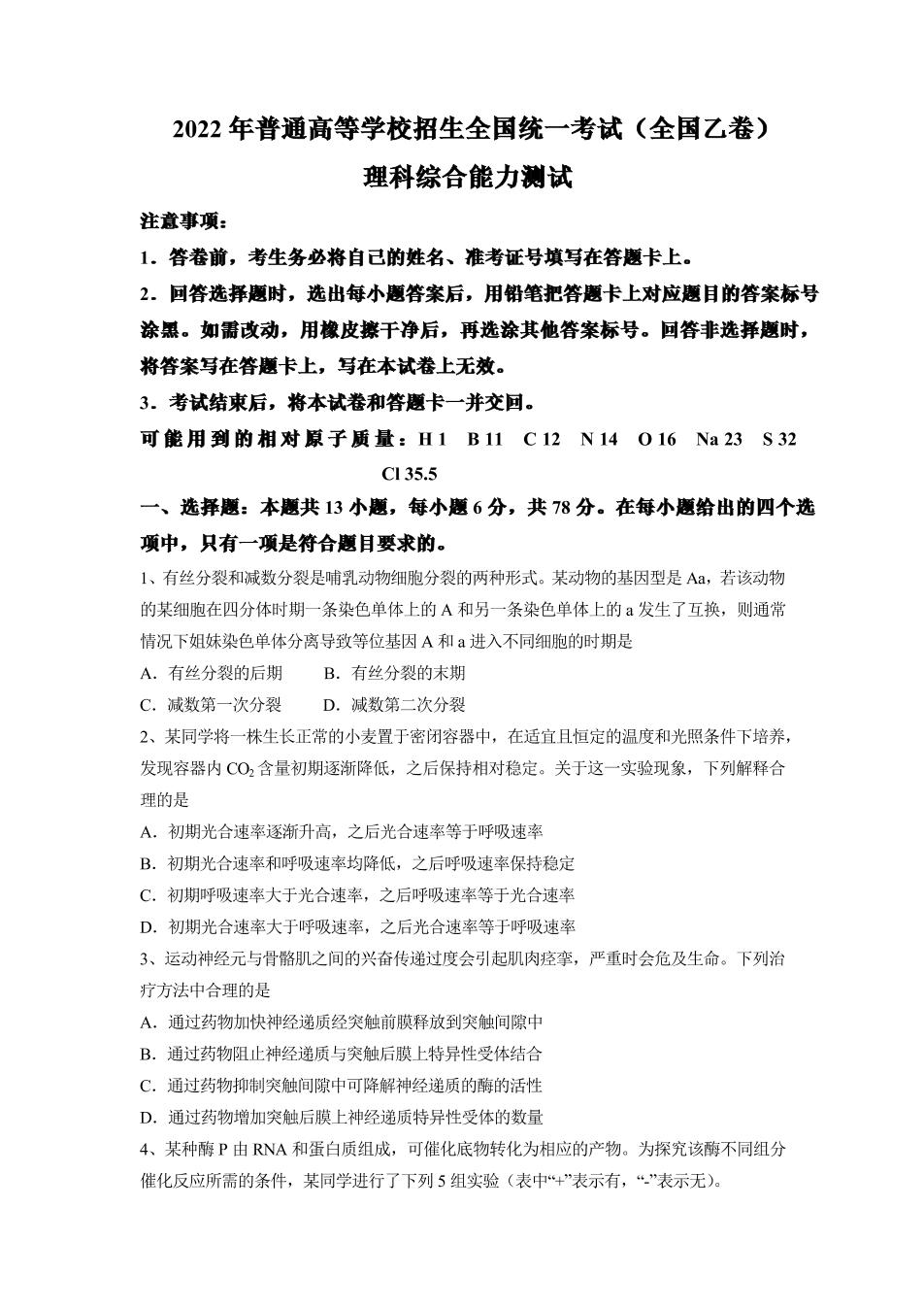 2022年高考全国乙卷-理综