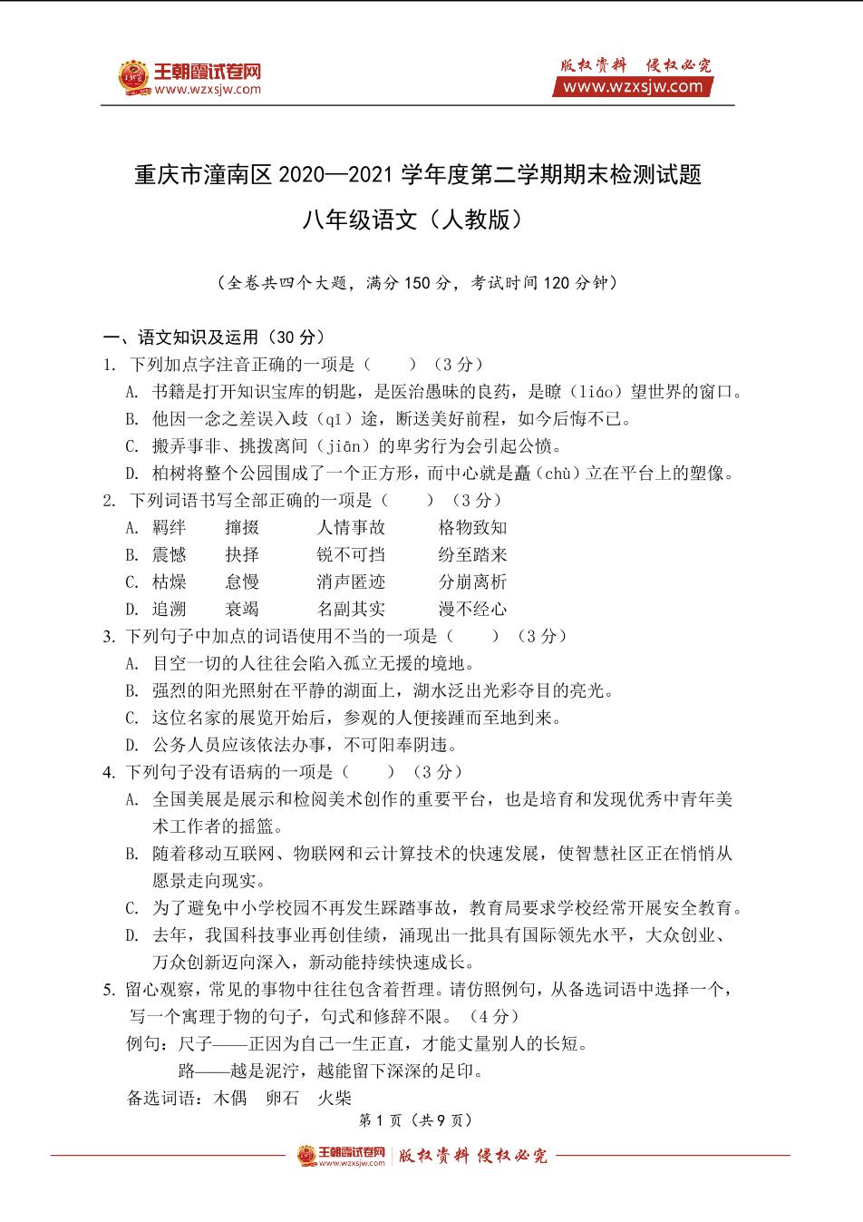 重庆市潼南区2020—2021学年度第二学期八年级语文期末检测试题(人教版)