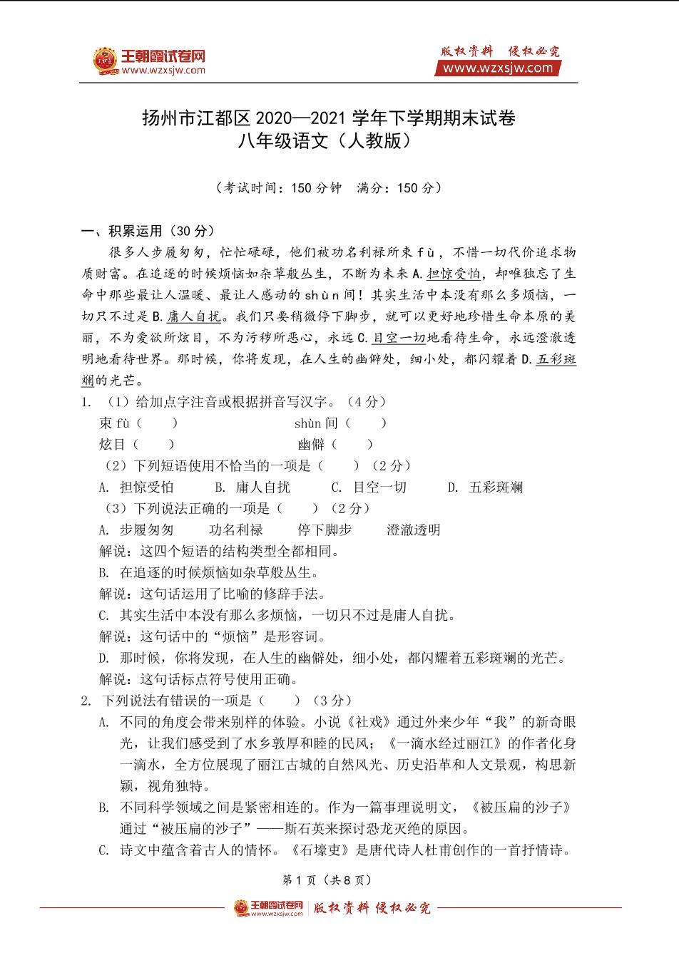 扬州市江都区2020—2021学年下学期期末试卷八年级语文(人教版)