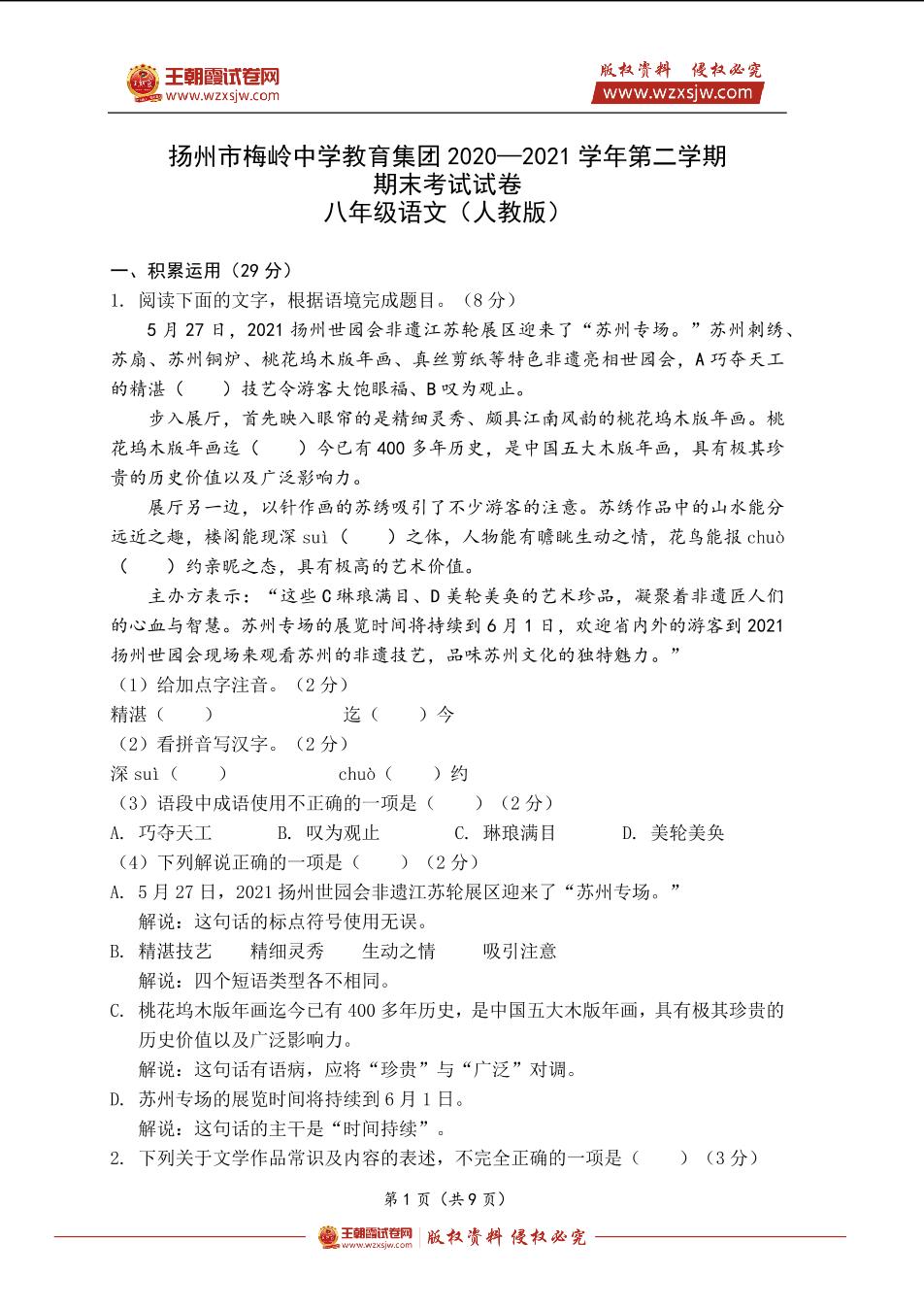 扬州市梅岭中学教育集团2020—2021学年第二学期期末考试试卷八年级语文(人教版)
