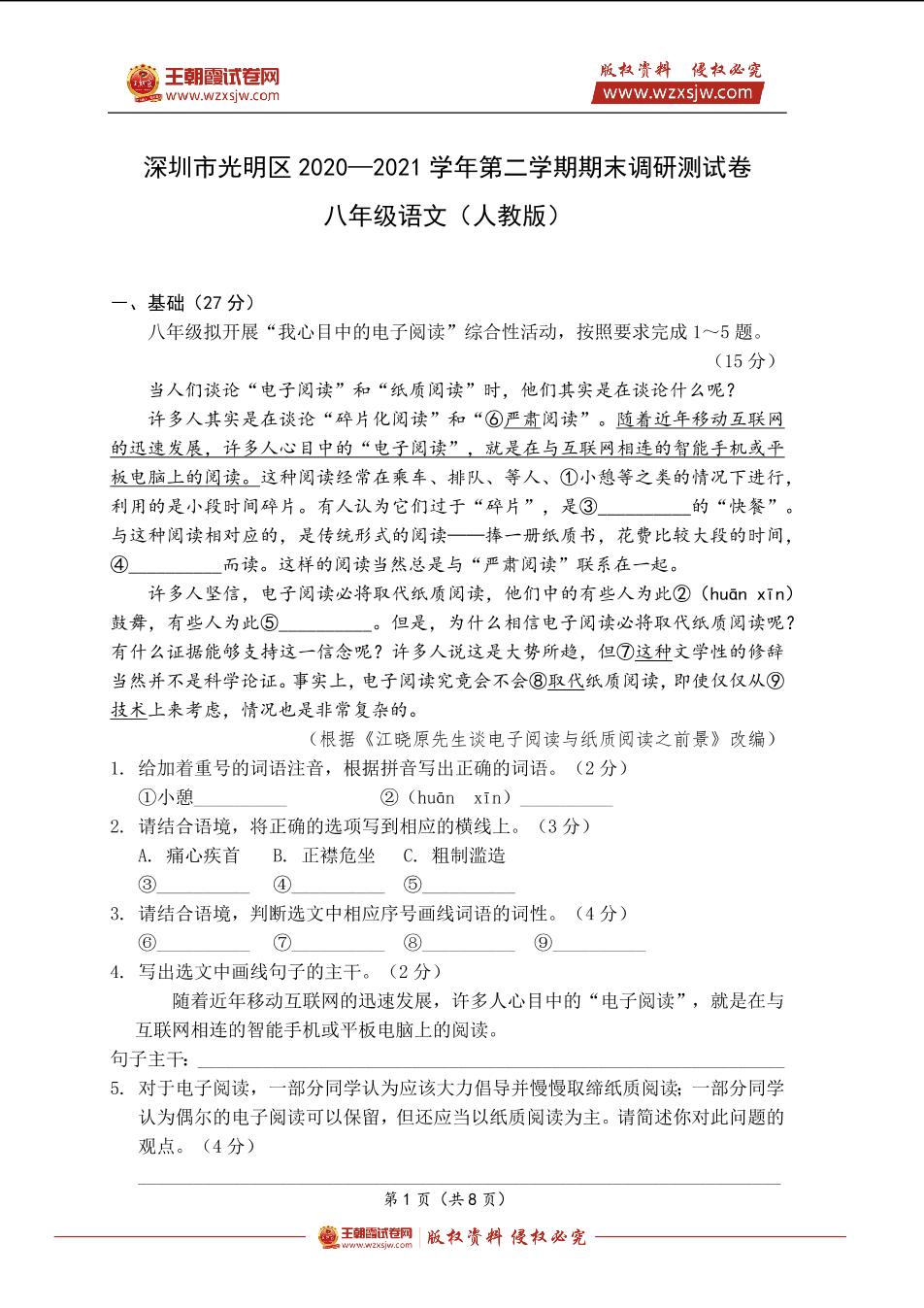 深圳市光明区2020—2021学年第二学期期末调研测试卷八年级语文(人教版)