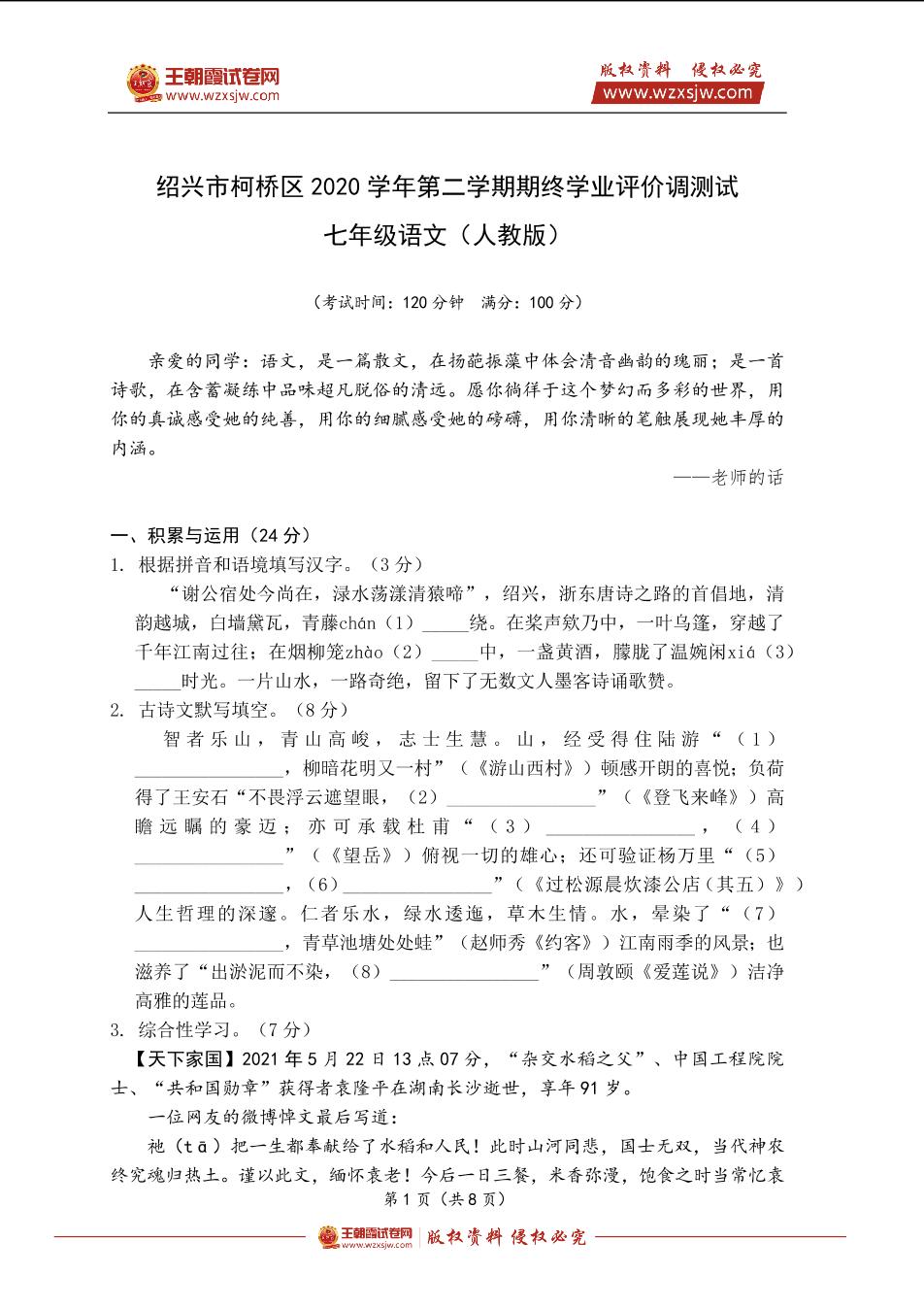 绍兴市柯桥区2020学年第二学期期终学业评价调测试七年级语文(人教版)