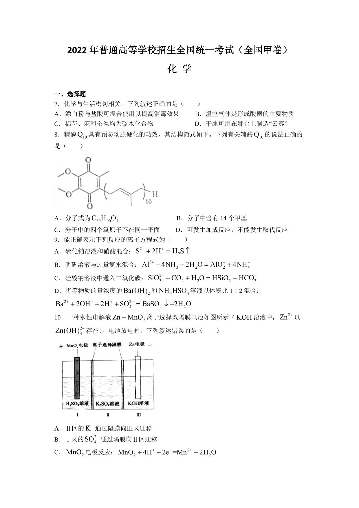 2022年高考全国甲卷-理综化学