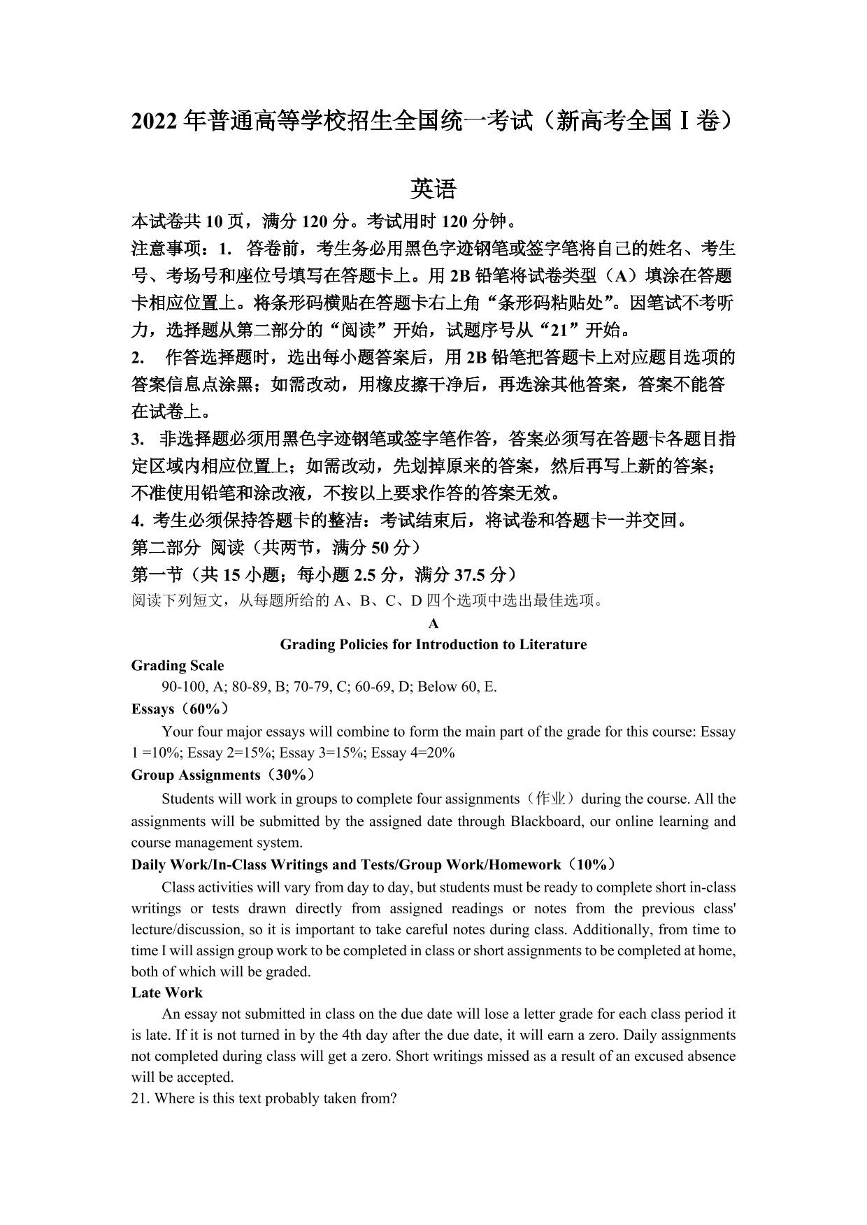 2022年新高考全国Ⅰ卷-英语【无听力音频】