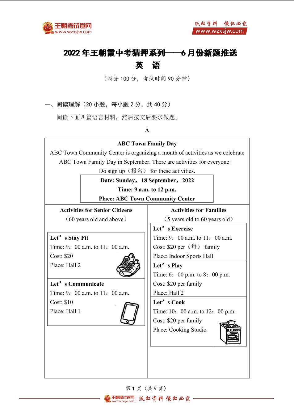 【英语】2022年王朝霞中考猜押系列——6月份新题推送