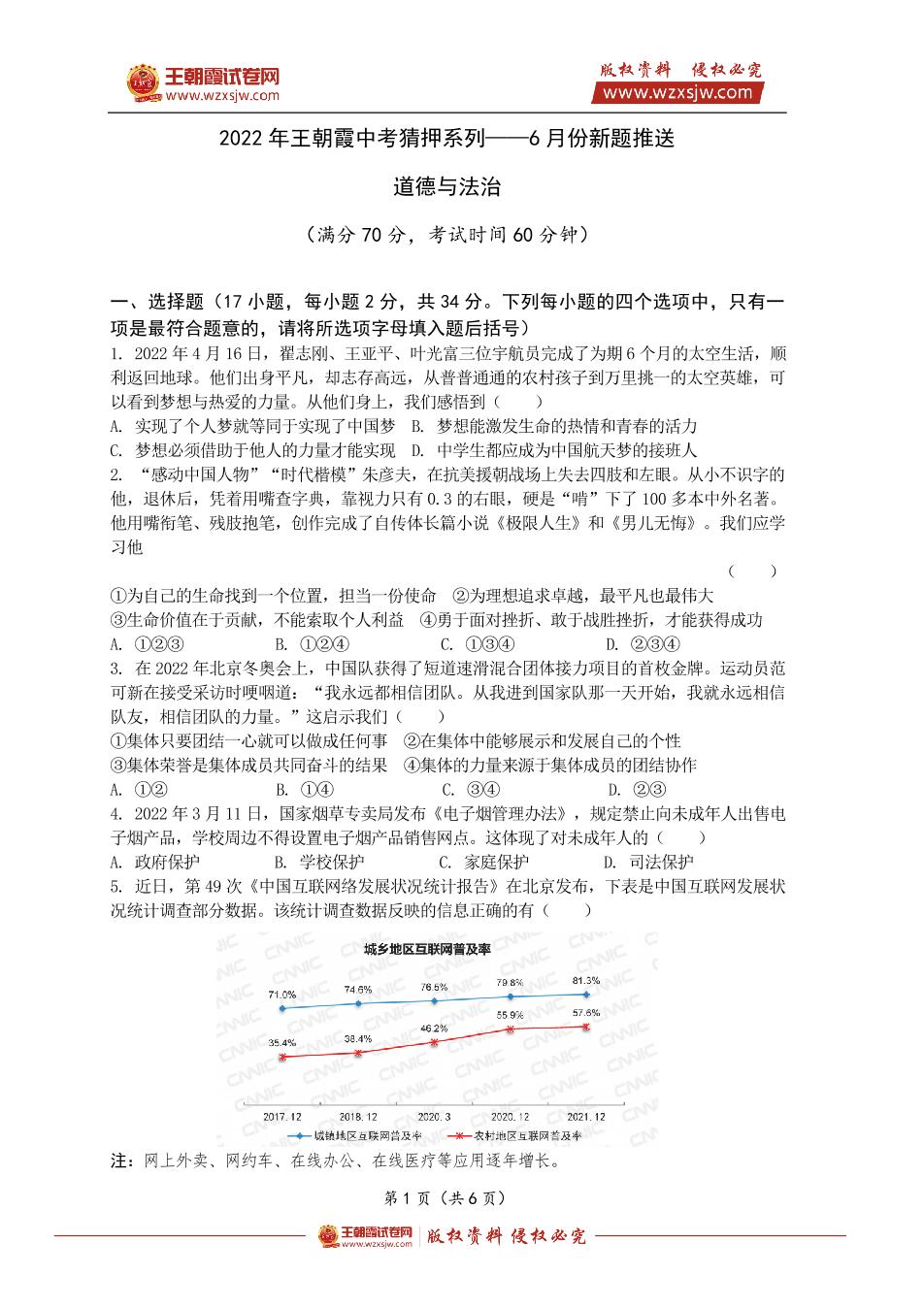 【道德与法治】2022年王朝霞中考猜押系列——6月份新题推送