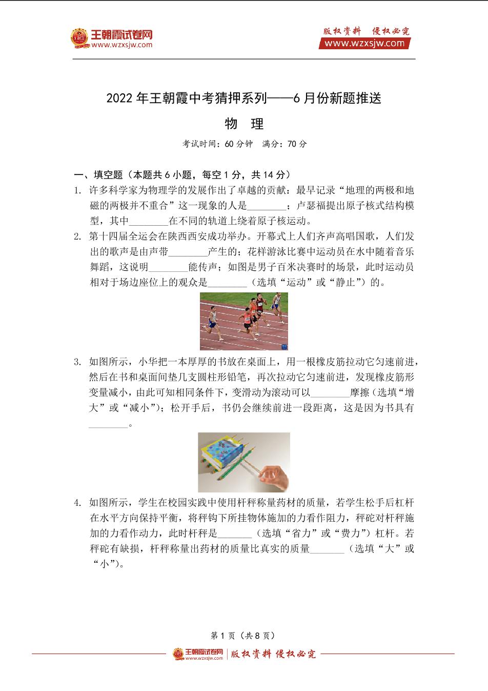 【物理】2022年王朝霞中考猜押系列——6月份新题推送