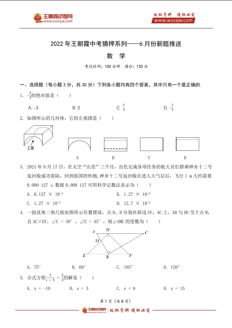 【数学】2022年王朝霞中考猜押系列——6月份新题推送
