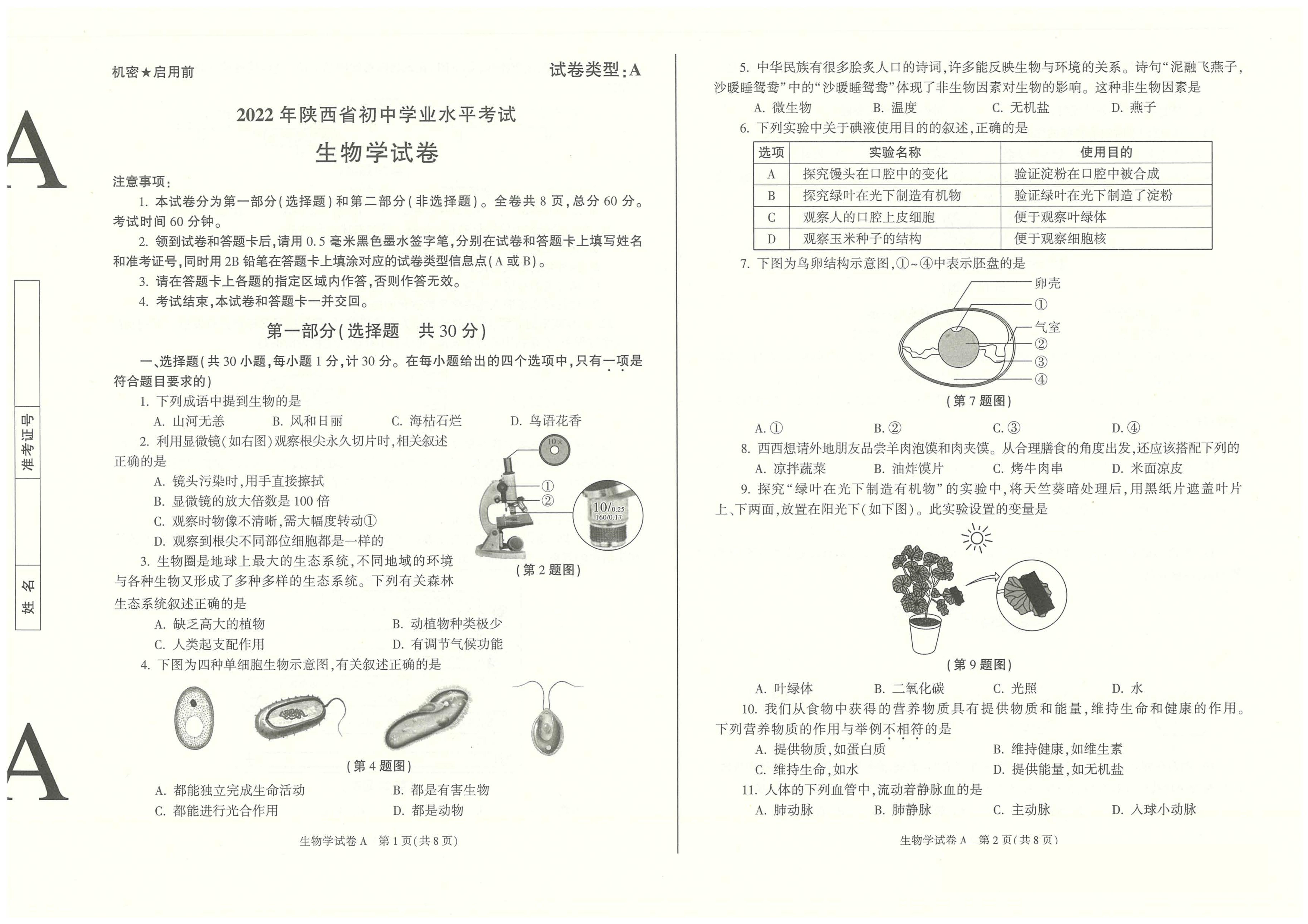 2022年陕西省初中学业水平考试生物学试卷A卷