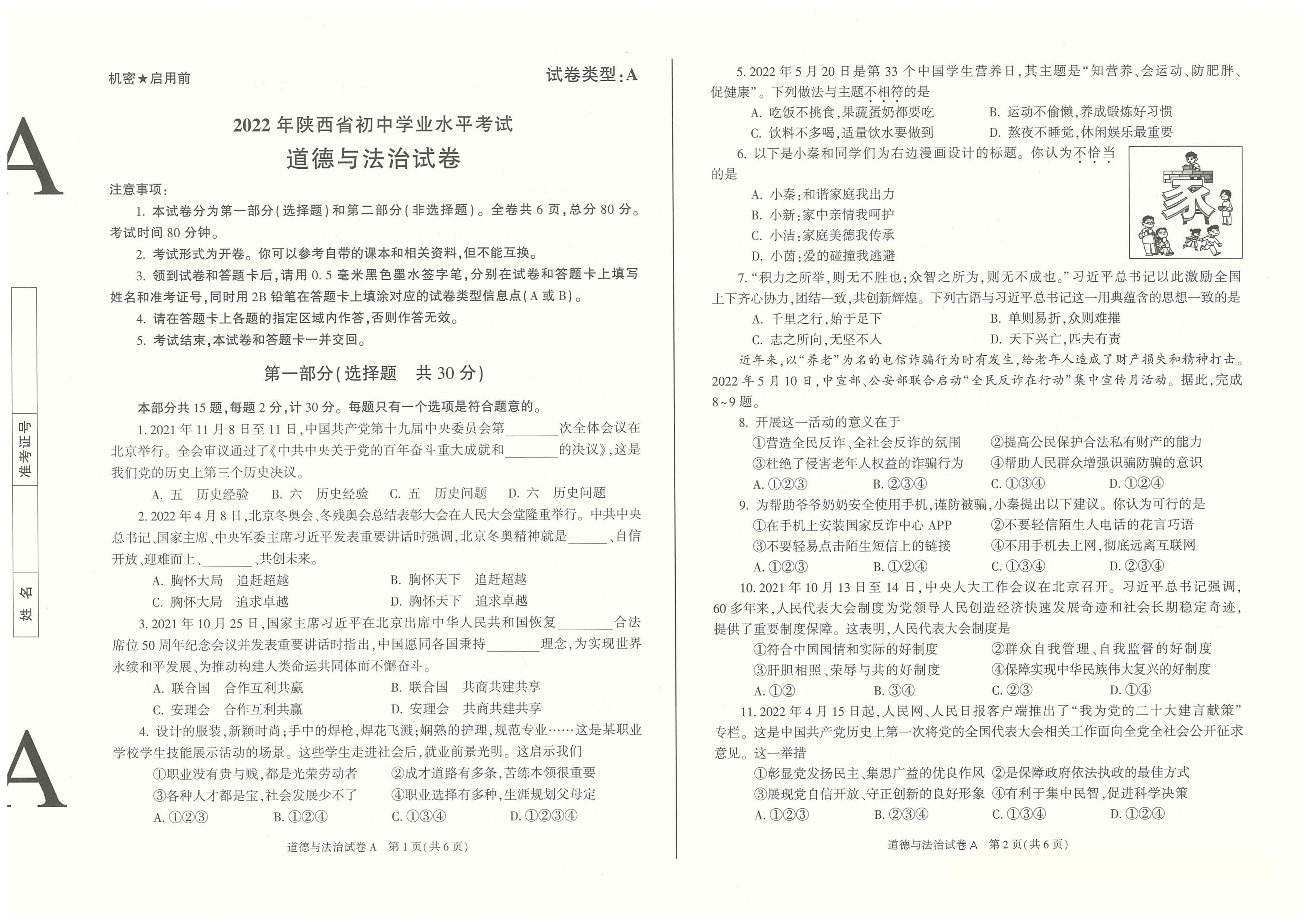 2022年陕西省初中学业水平考试道德与法治