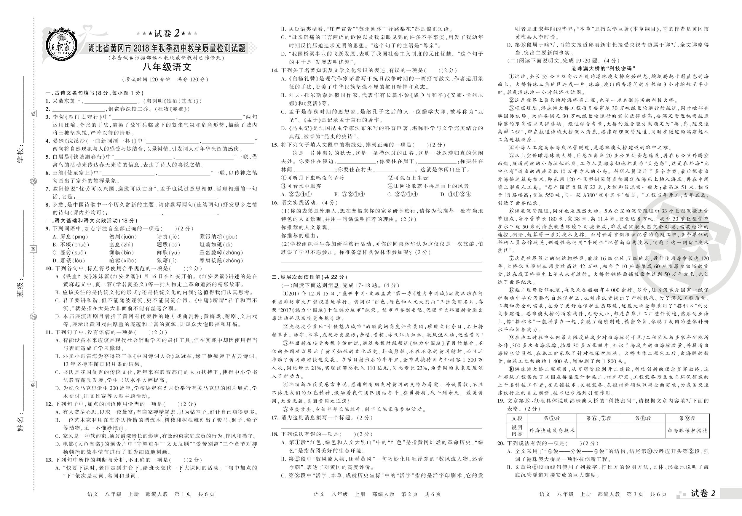 2018-2019学年第一学期湖北省黄冈市八年级语文试卷(人教版)【2】