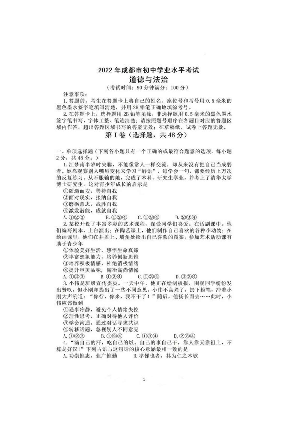 2022年四川省成都市中考道德与法治真题