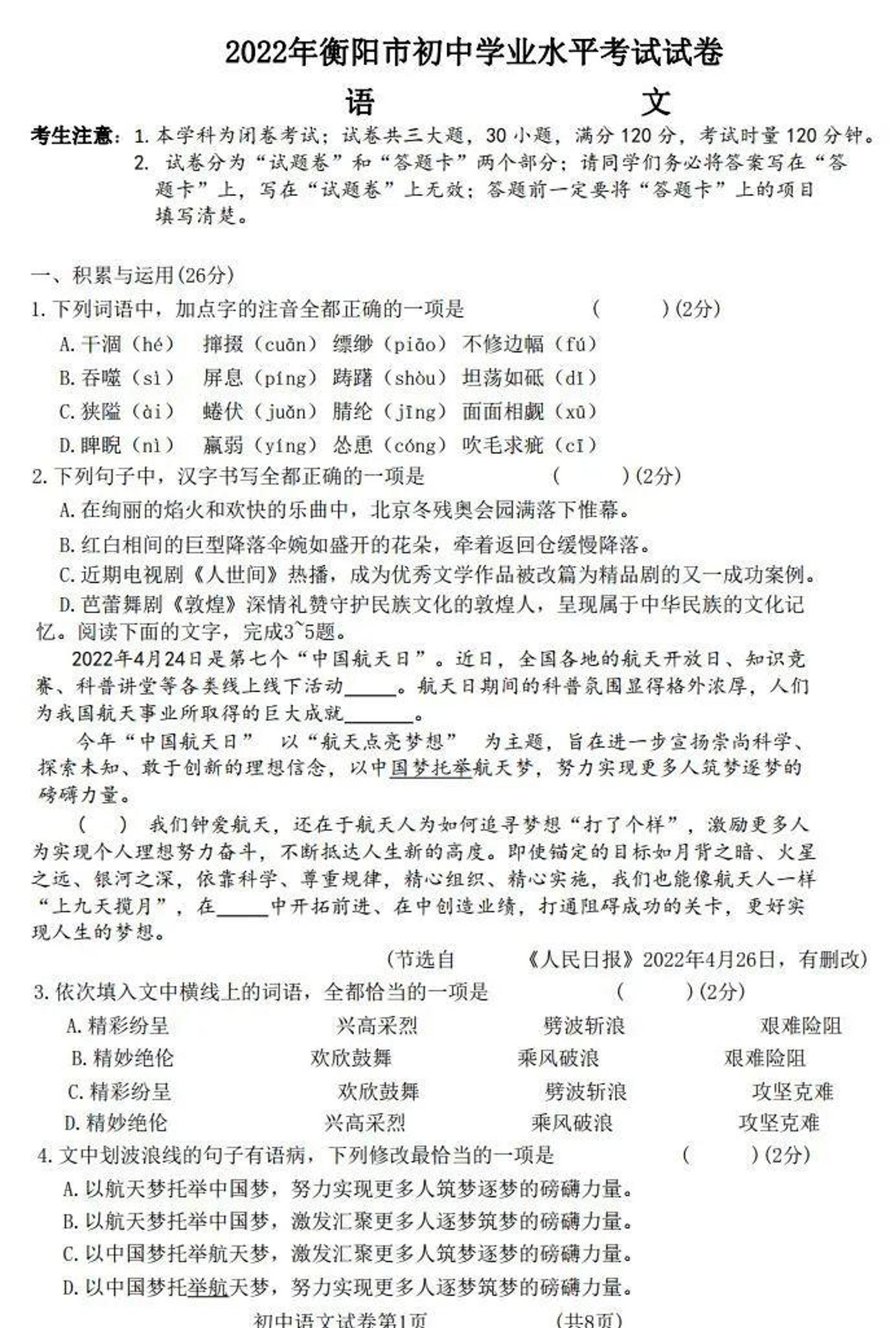 2022年湖南省衡阳市中考语文真题