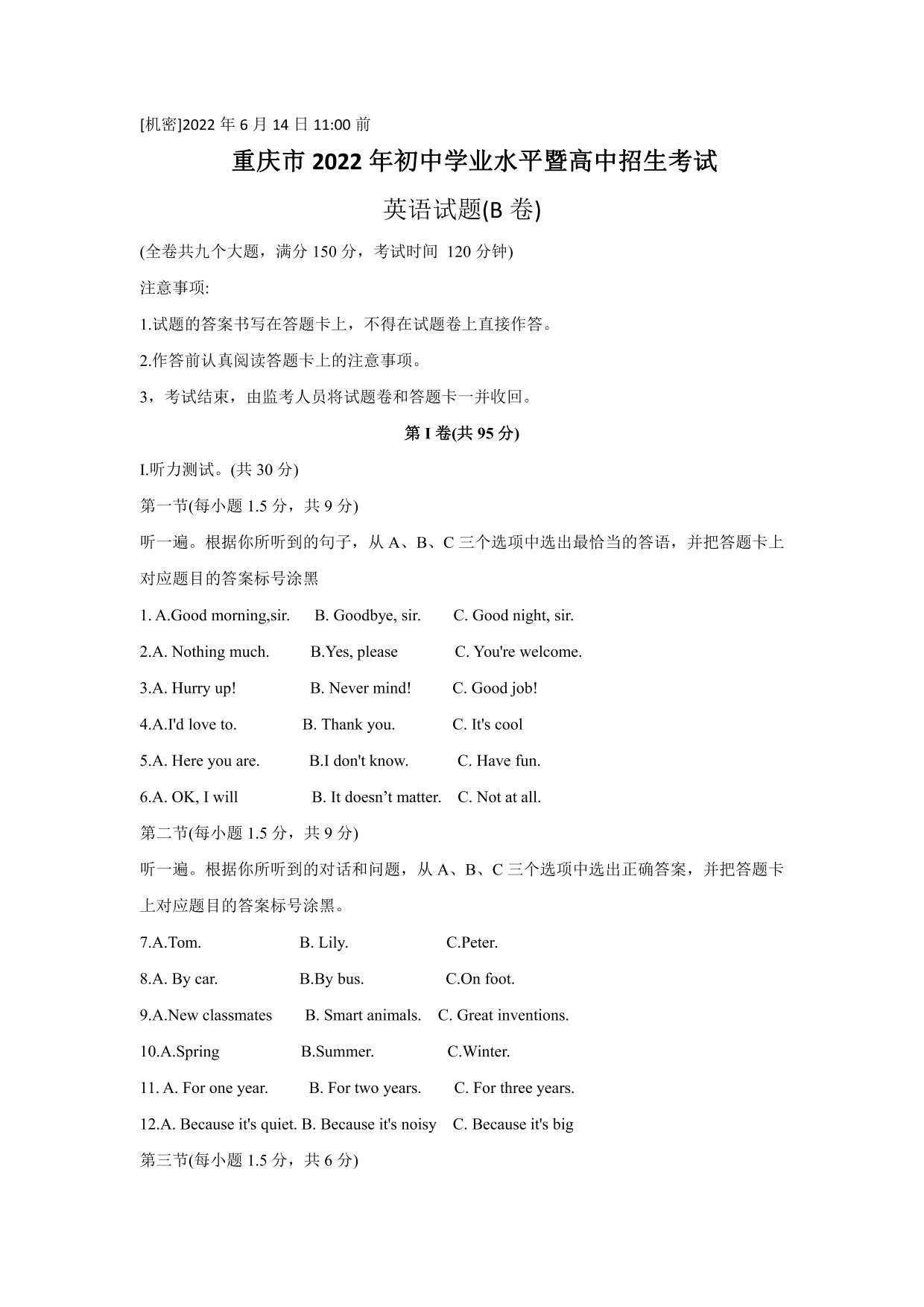 2022年重庆市中考英语真题(B卷)【无听力音频】