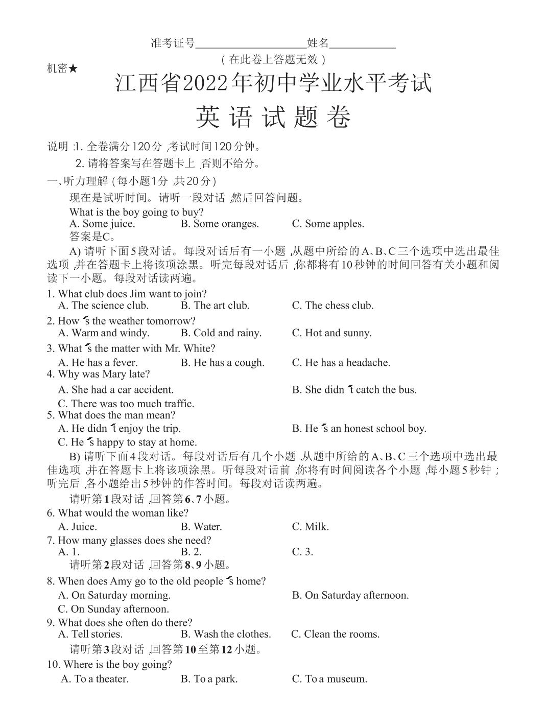 2022年江西省中考英语真题【无听力音频】