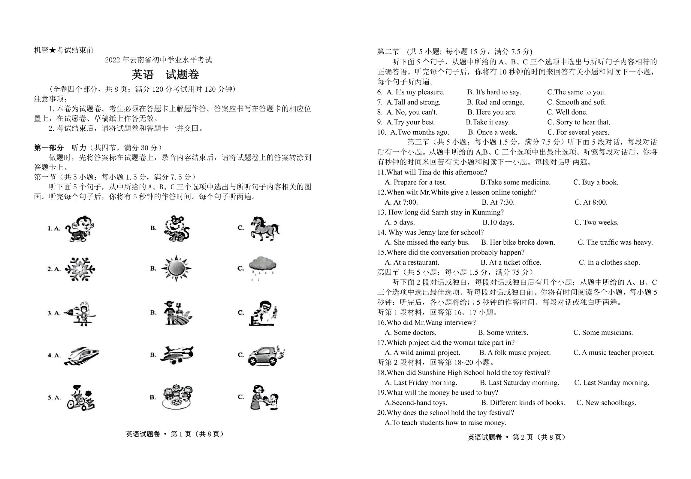 2022年云南省中考英语真题【无听力音频】