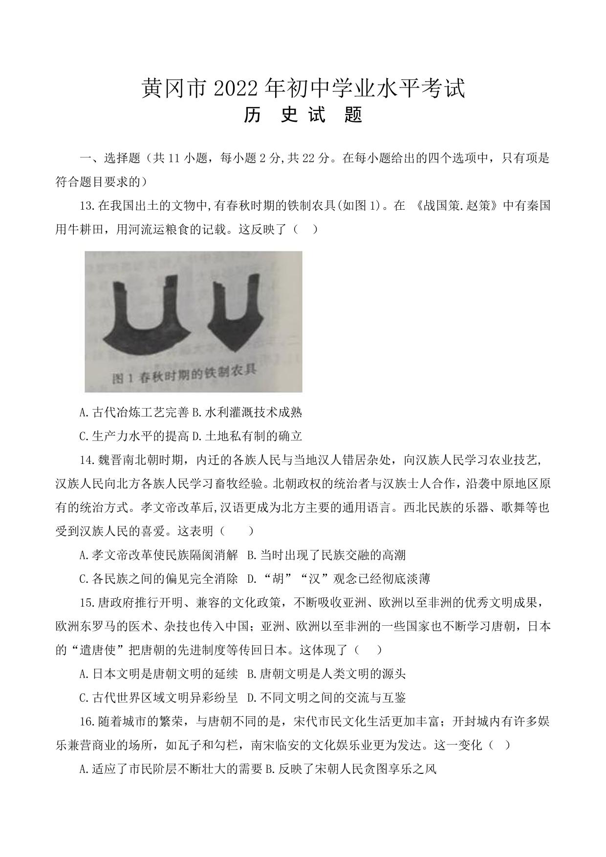 2022年湖北省黄冈市、孝感市、咸宁市三市中考历史真题