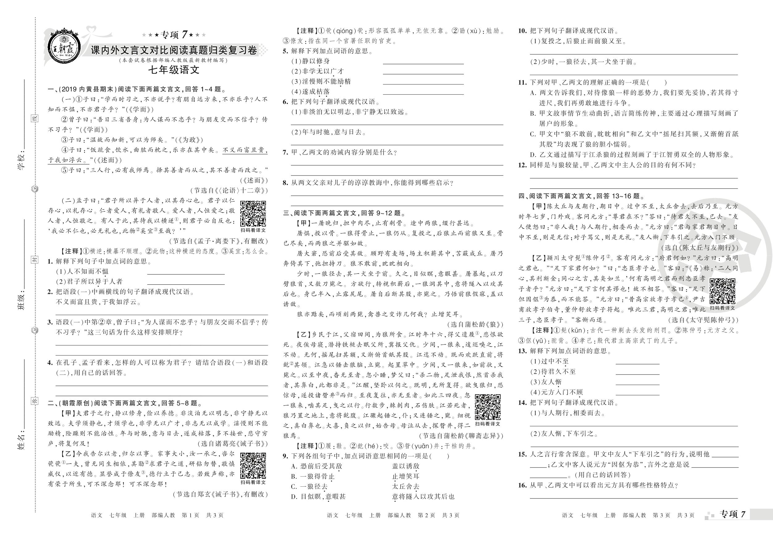 王朝霞期末专项卷——课内外文言文对比阅读、古诗词阅读真题归类复习七年级上册语文(人教版)_R21080231256【0】