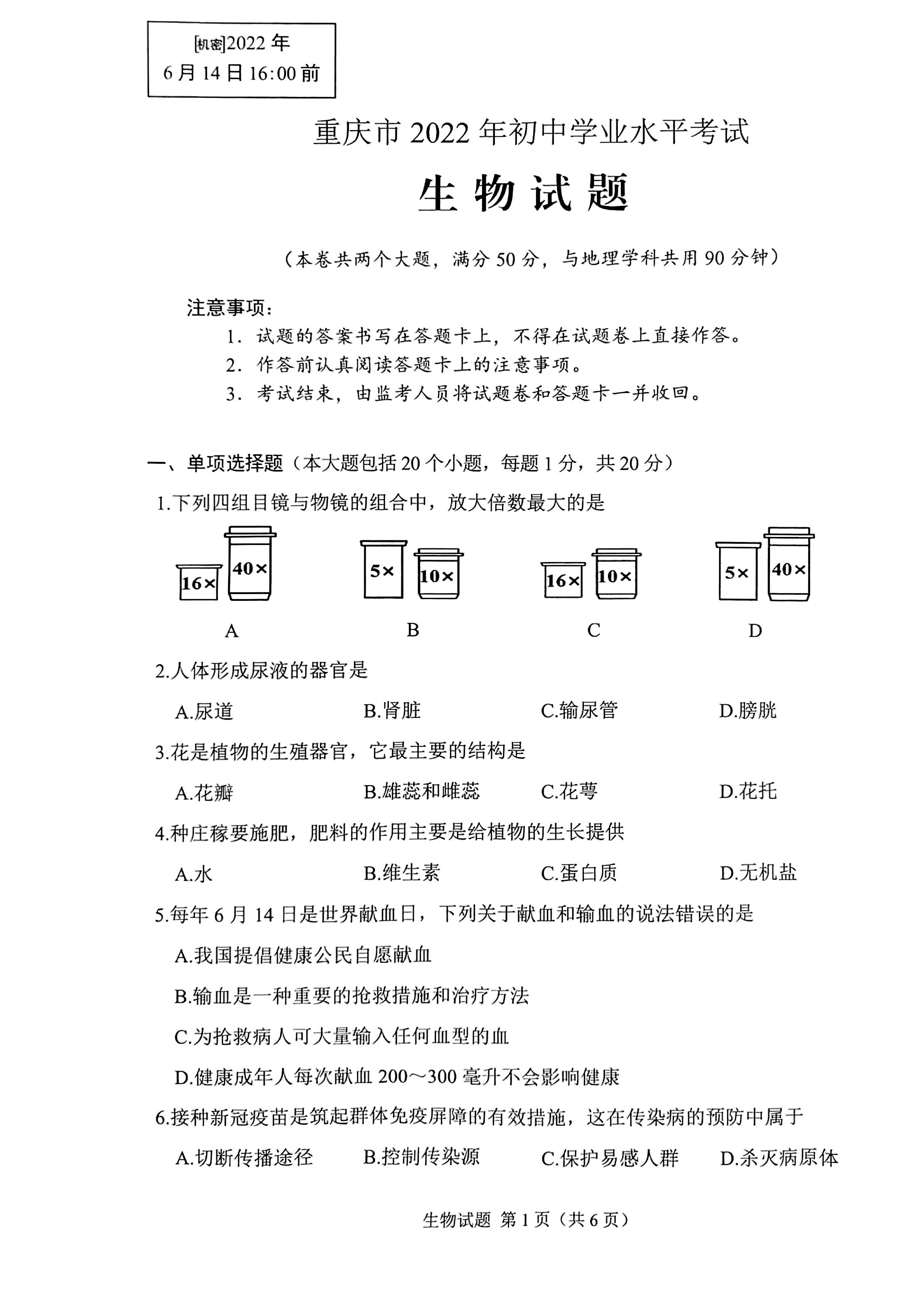 2022年重庆市中考生物真题