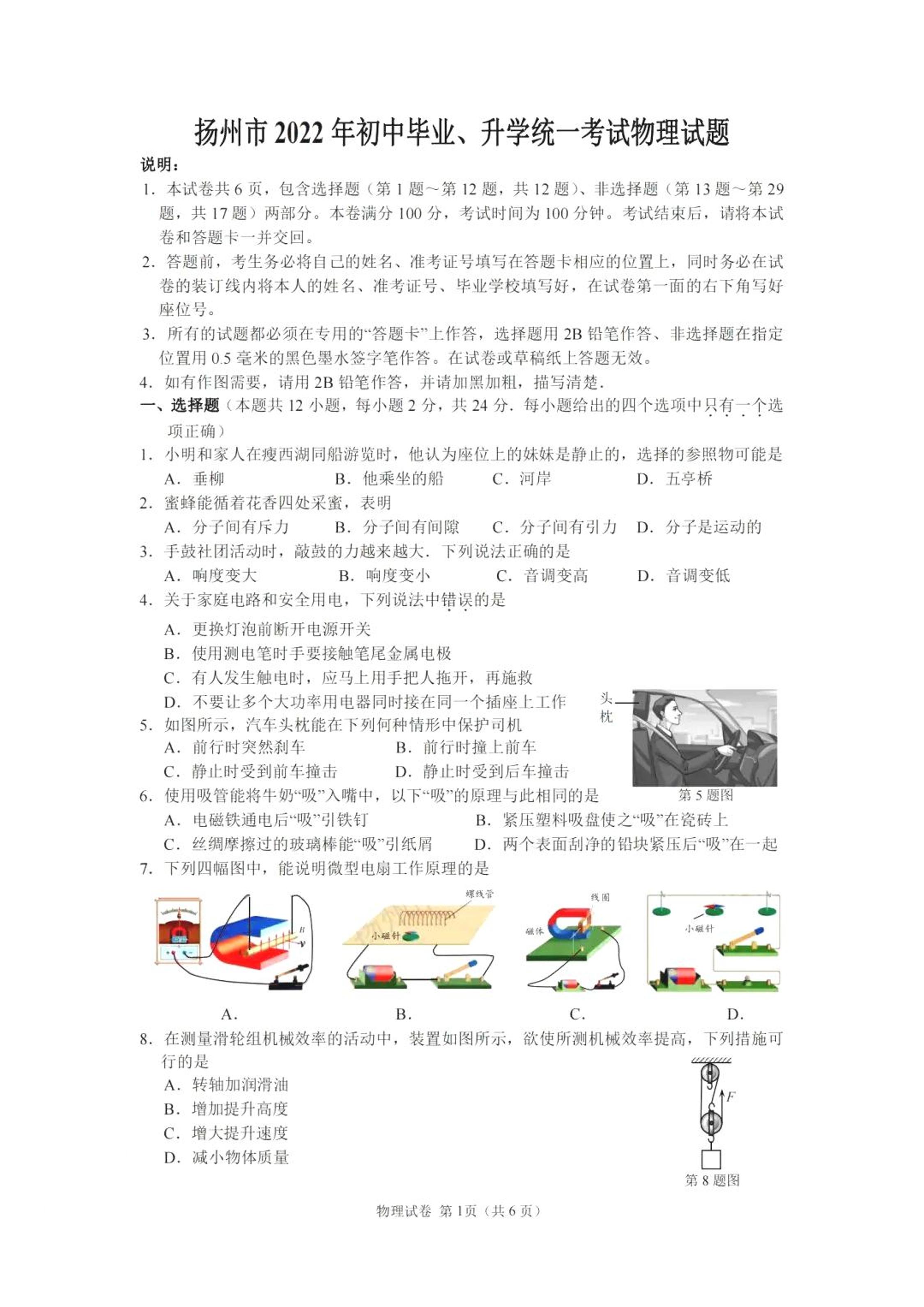 2022年江苏省扬州市中考物理真题