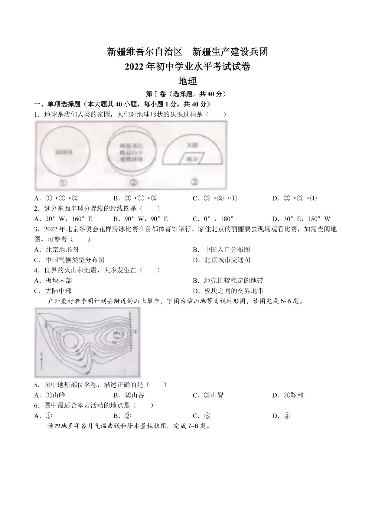 2022年新疆维吾尔自治区新疆生产建设兵团中考地理真题(无答案)